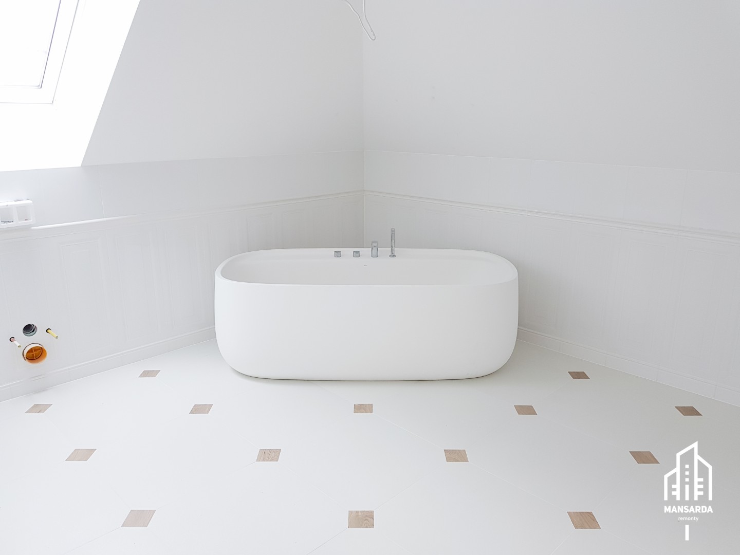 Odpływy liniowe/ścienne, baterie podtynkowe, czysta bryła bez “wystających” elementów.Płytki wielkoformatowe i trudne detale