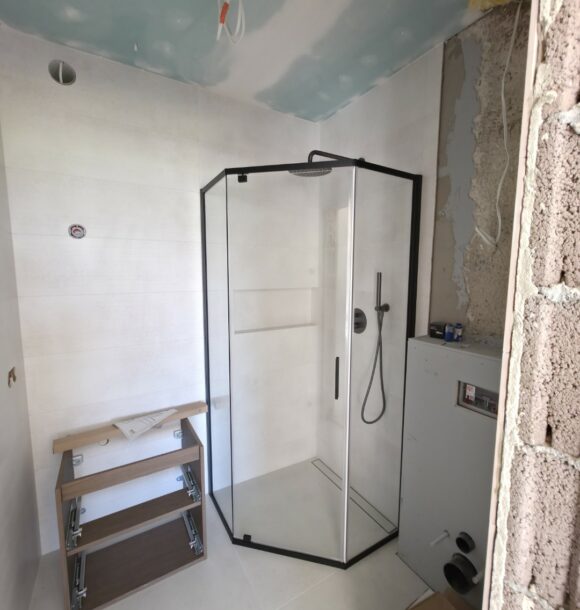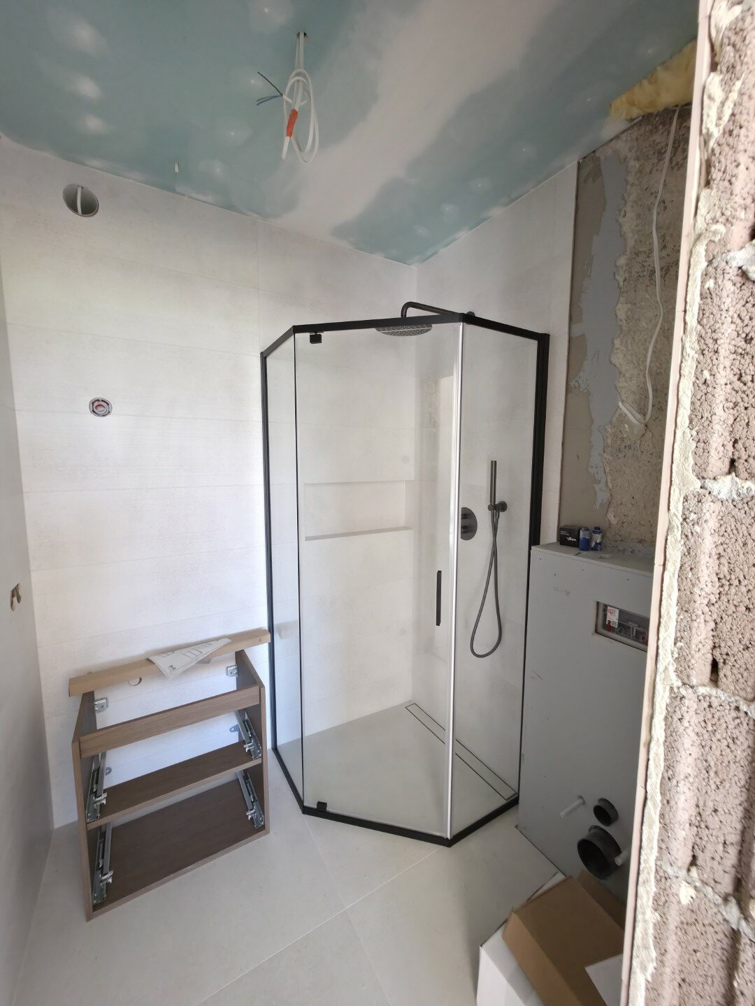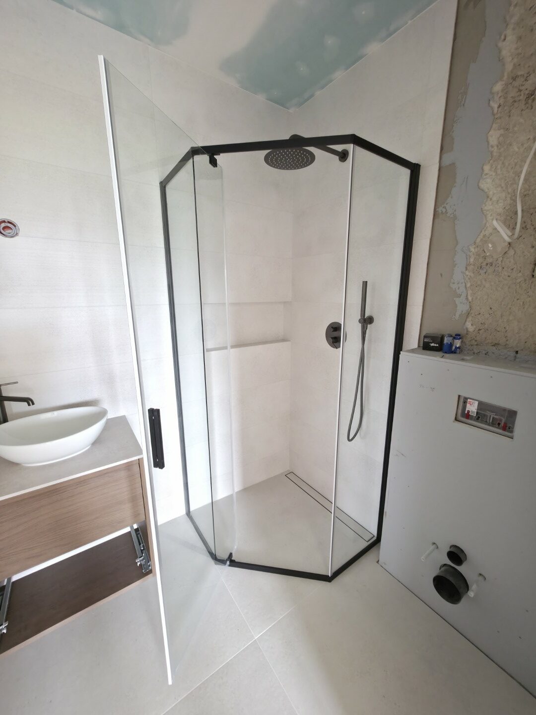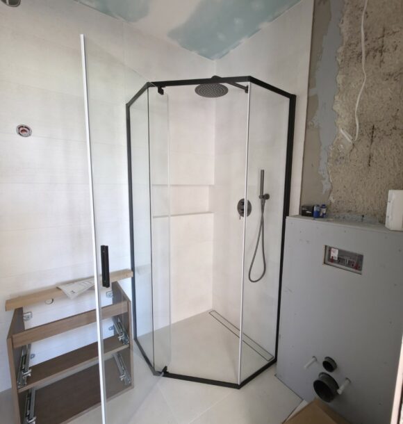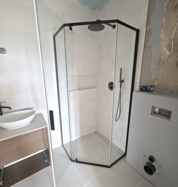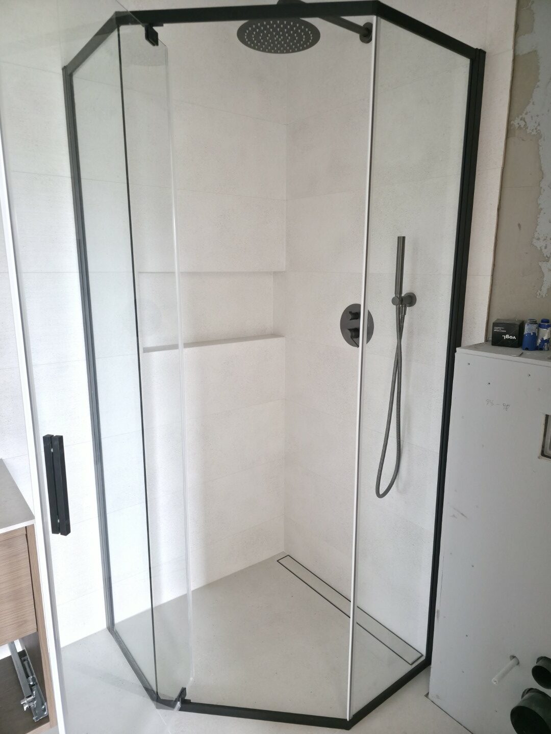 Projektowanie i wykonawstwo małych łazienek to sprawdzian precyzji. W tym pomieszczeniu kluczowym wyzwaniem było wykonanie odpowiednich spadków posadzki pod nietypową, pięciokątną kabinę prysznicową. Zastosowaliśmy tu odpływ liniowy, co wymagało idealnego docięcia wielkoformatowych płyt podłogowych, aby woda spływała grawitacyjnie, a estetyka pozostała nienaruszona.