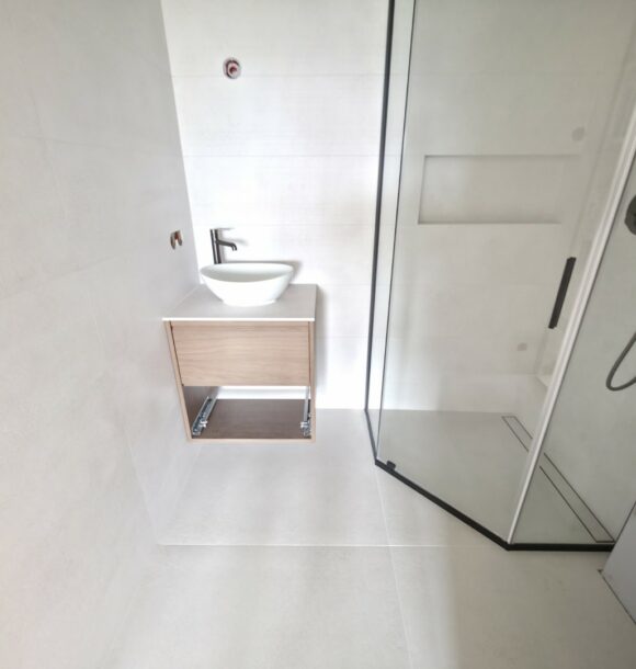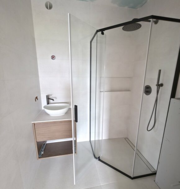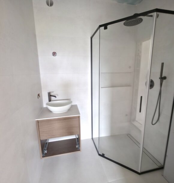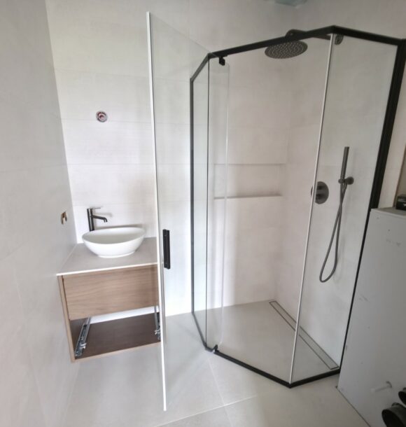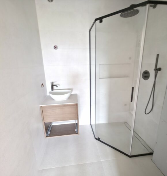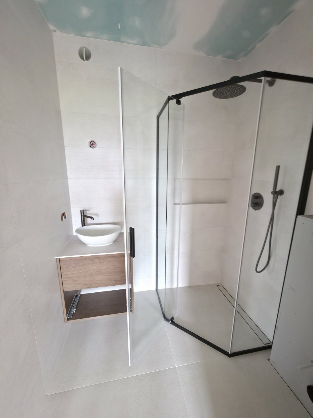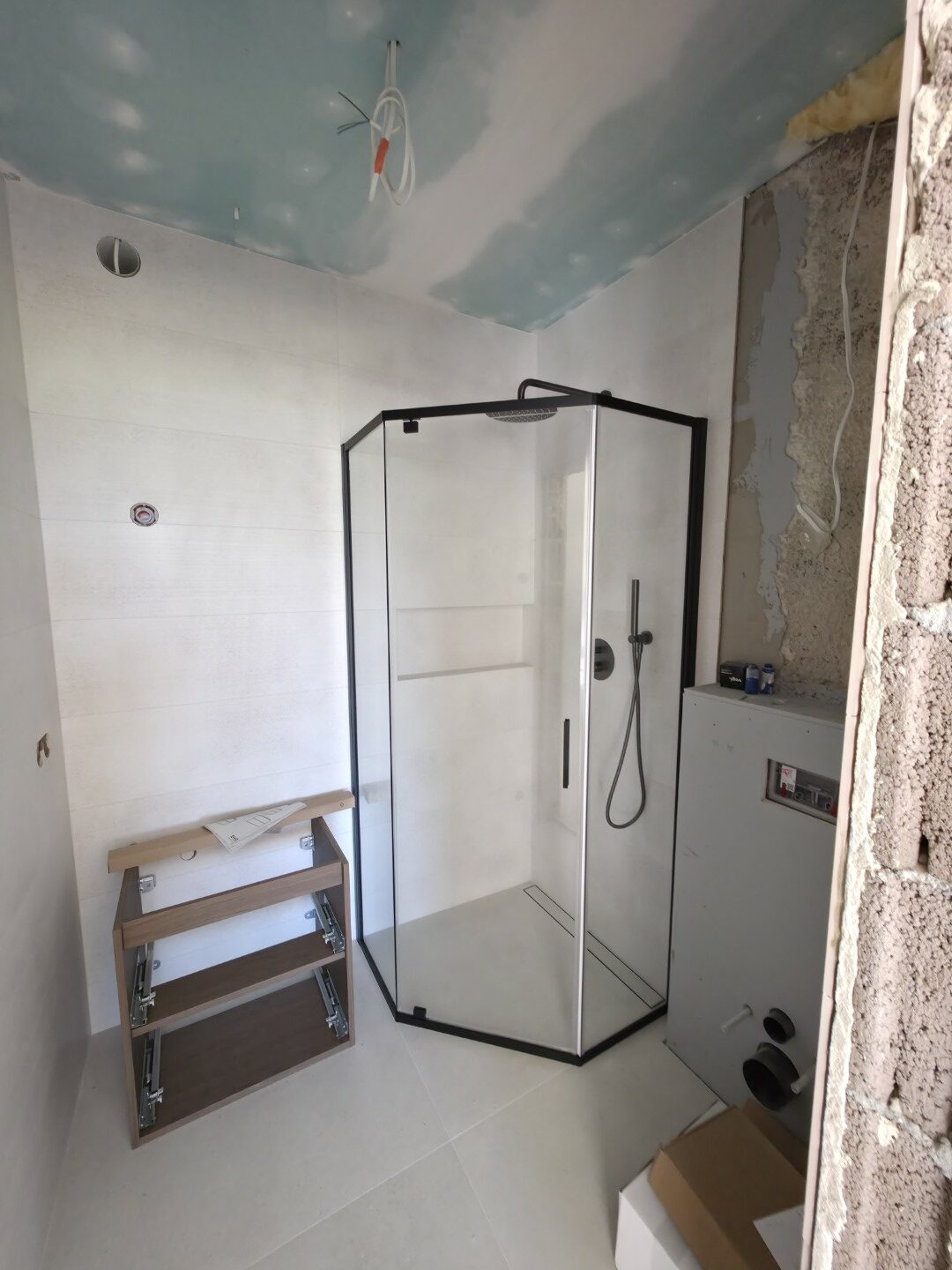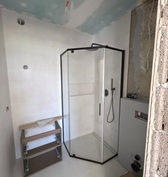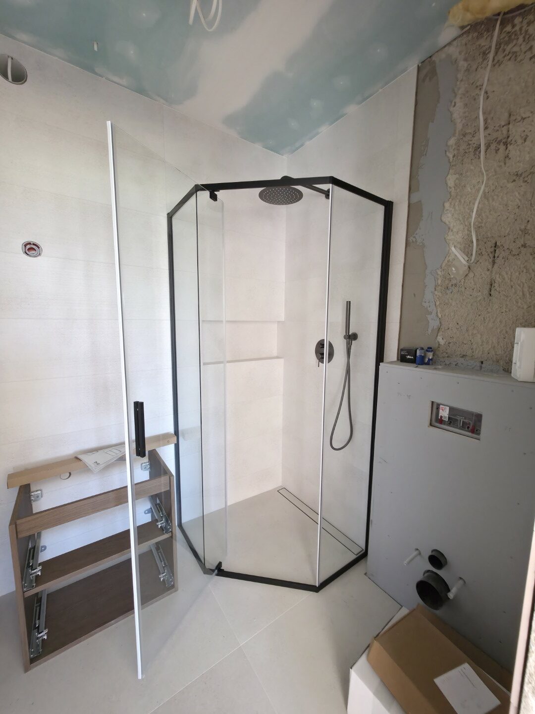 Projektowanie i wykonawstwo małych łazienek to sprawdzian precyzji. W tym pomieszczeniu kluczowym wyzwaniem było wykonanie odpowiednich spadków posadzki pod nietypową, pięciokątną kabinę prysznicową. Zastosowaliśmy tu odpływ liniowy, co wymagało idealnego docięcia wielkoformatowych płyt podłogowych, aby woda spływała grawitacyjnie, a estetyka pozostała nienaruszona.