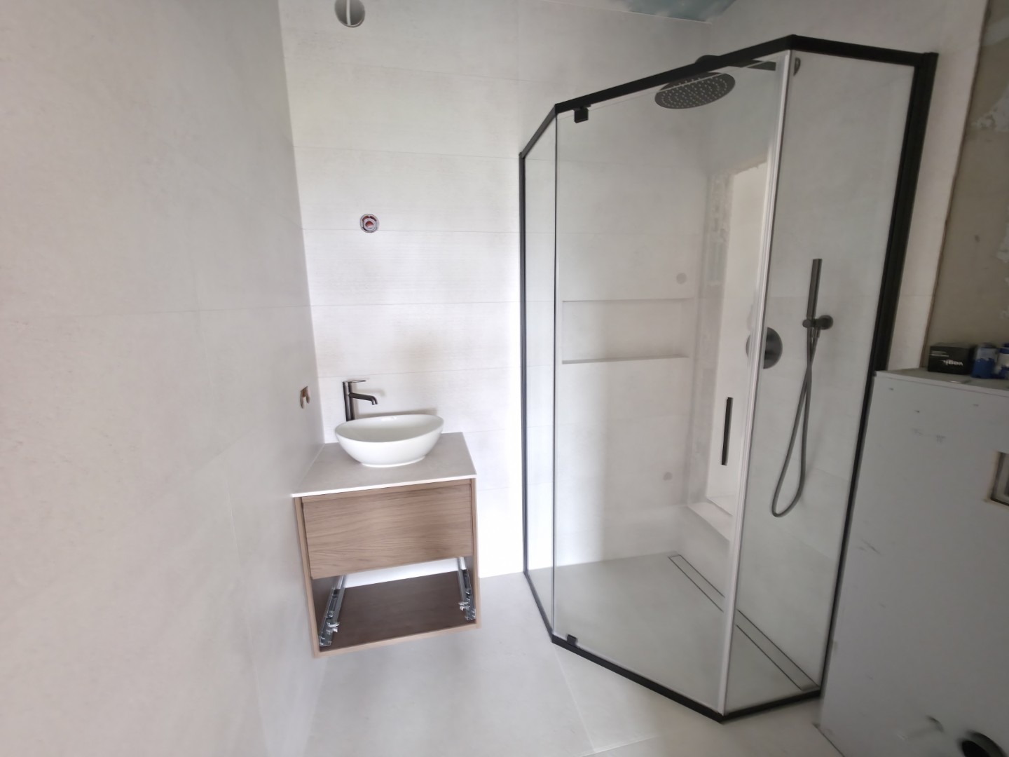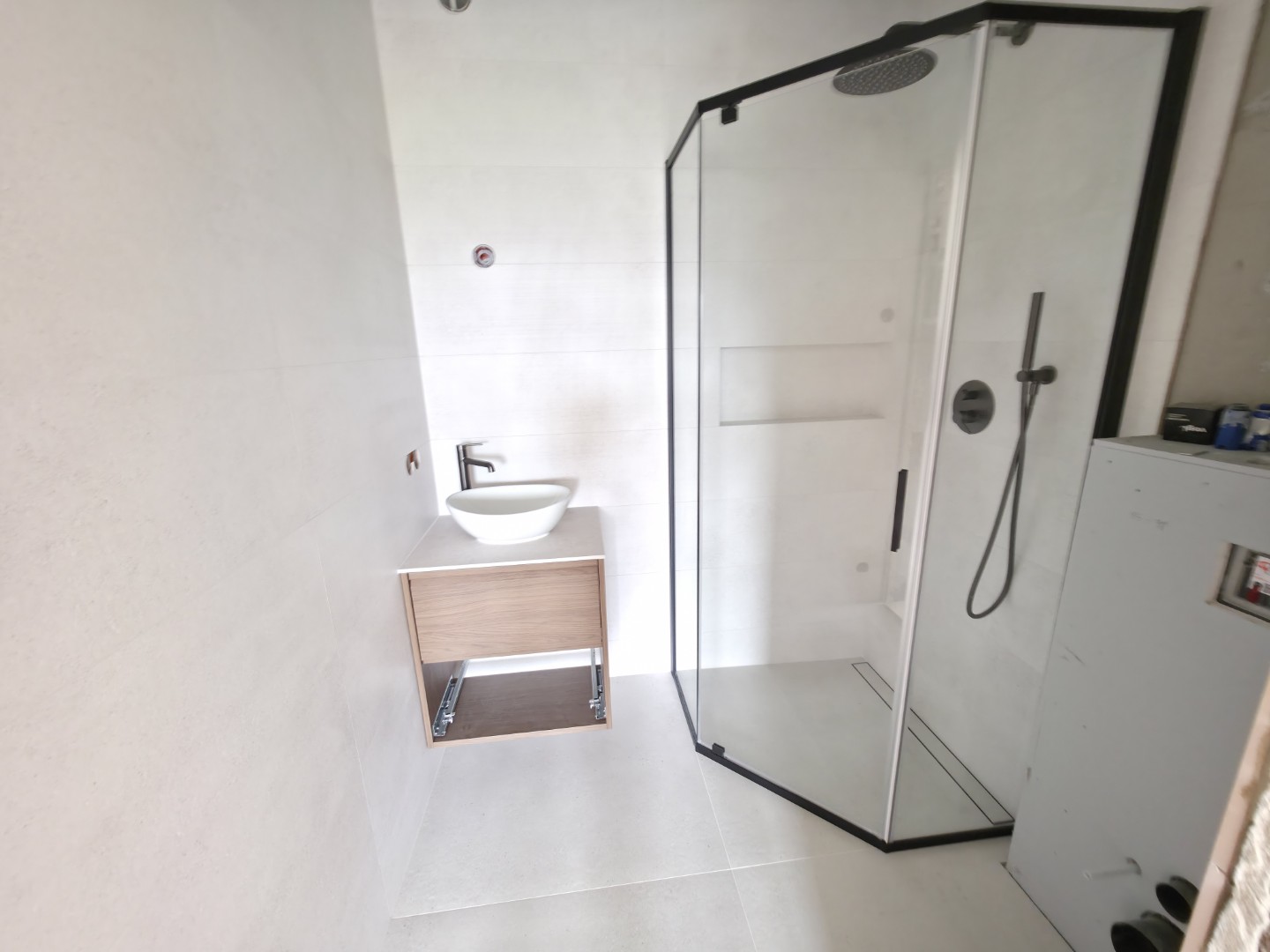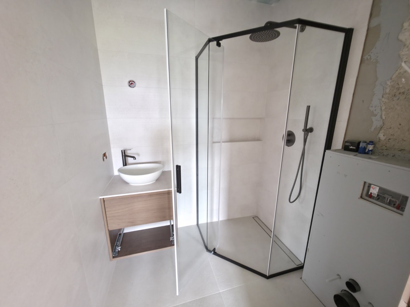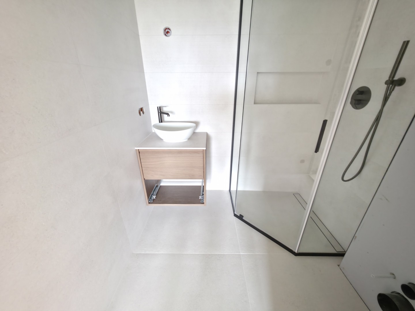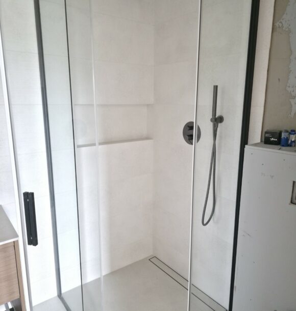 Projektowanie i wykonawstwo małych łazienek to sprawdzian precyzji. W tym pomieszczeniu kluczowym wyzwaniem było wykonanie odpowiednich spadków posadzki pod nietypową, pięciokątną kabinę prysznicową. Zastosowaliśmy tu odpływ liniowy, co wymagało idealnego docięcia wielkoformatowych płyt podłogowych, aby woda spływała grawitacyjnie, a estetyka pozostała nienaruszona.