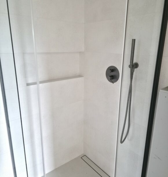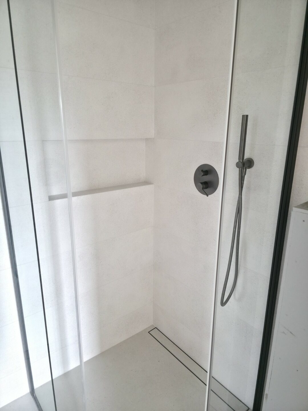 Podobnie jak w poprzednich łazienkach z tej inwestycji, nie szliśmy na łatwiznę z półkami. Wykuliśmy wnękę na kosmetyki w ścianie prysznicowej, oszczędzając cenną przestrzeń wewnątrz kabiny. To detale budowlane, które robią różnicę w komforcie użytkowania.