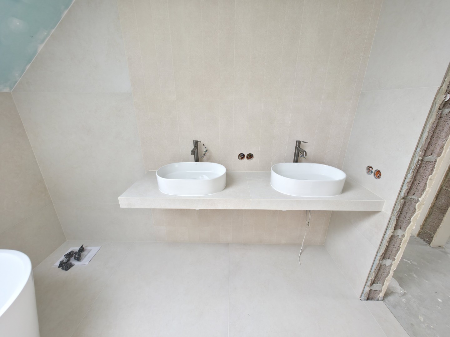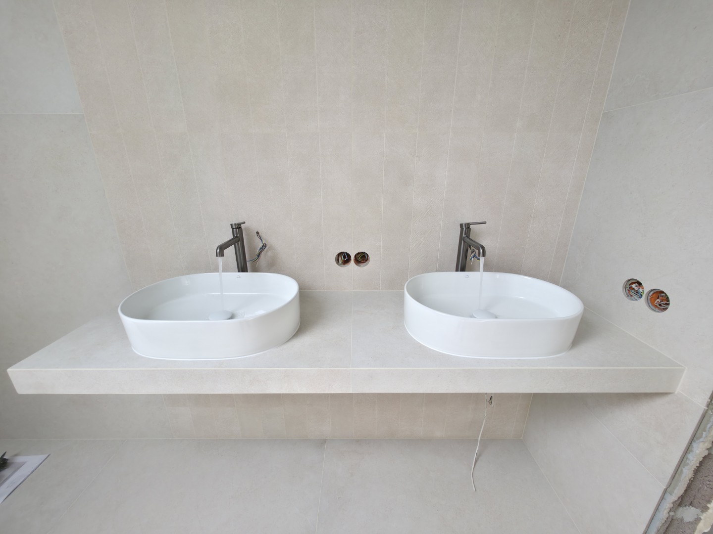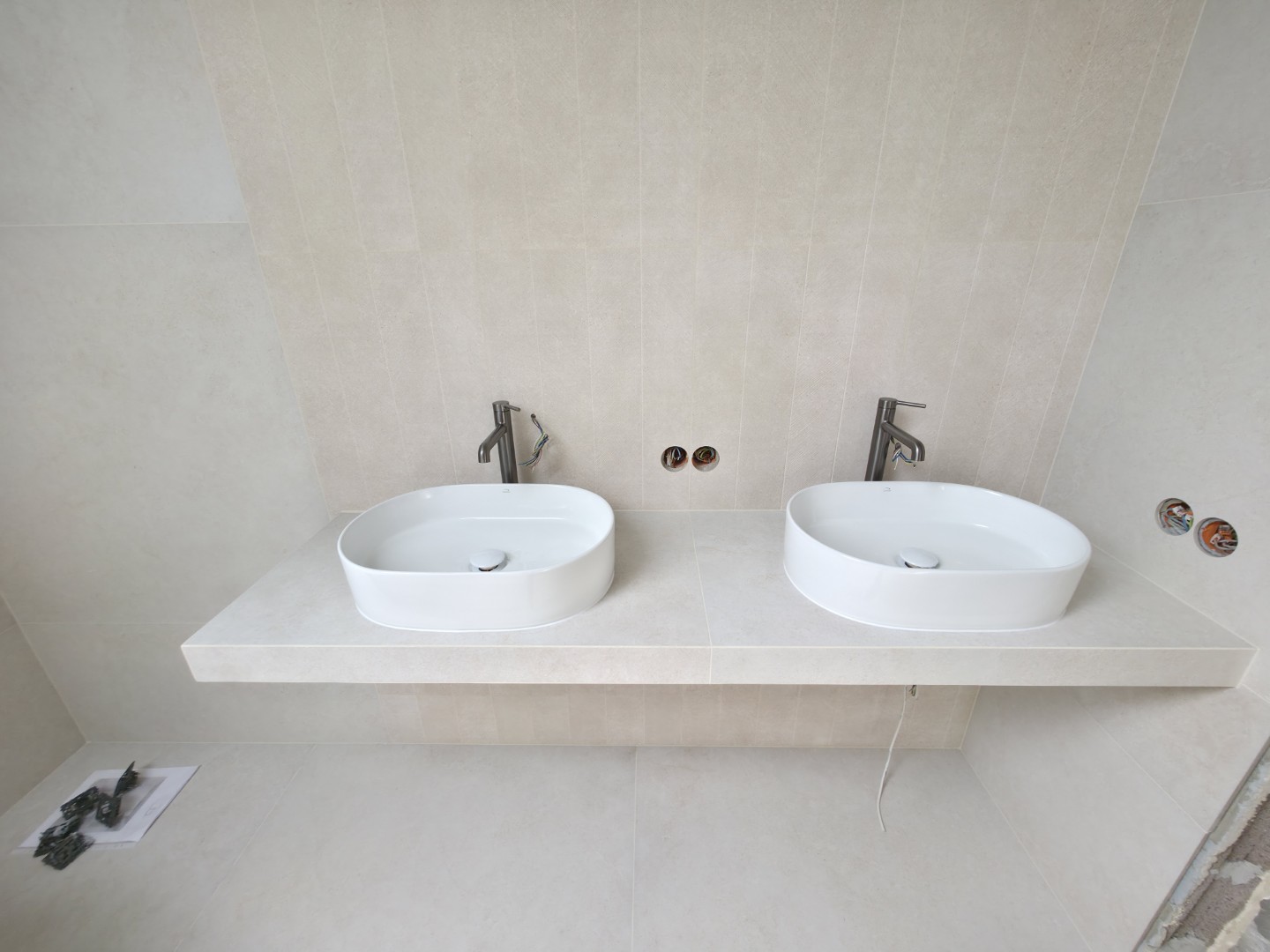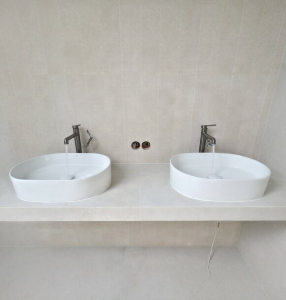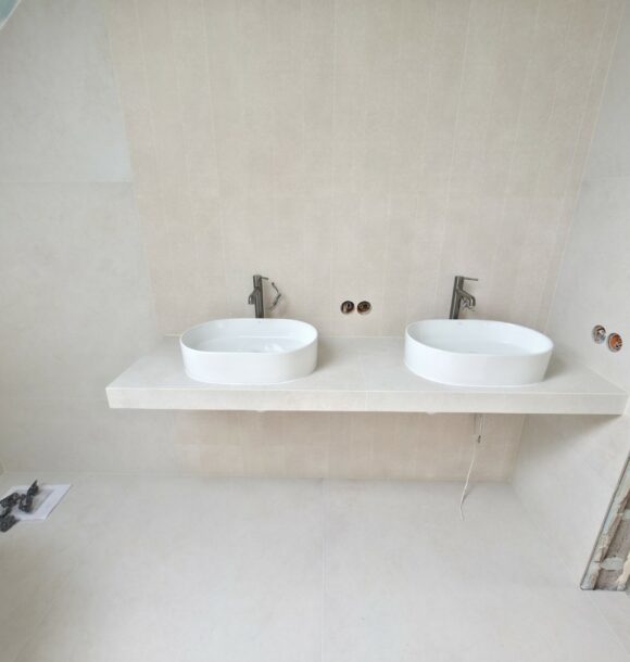 W tym projekcie zrezygnowaliśmy z gotowych mebli na rzecz rozwiązania „szytego na miarę”. Wykonaliśmy podwieszany blat pod dwie umywalki w całości z płytek gresowych. Wymagało to perfekcyjnego szlifowania krawędzi pod kątem 45 stopni (gierowanie), aby uzyskać efekt pełnej bryły kamienia bez widocznych łączeń.