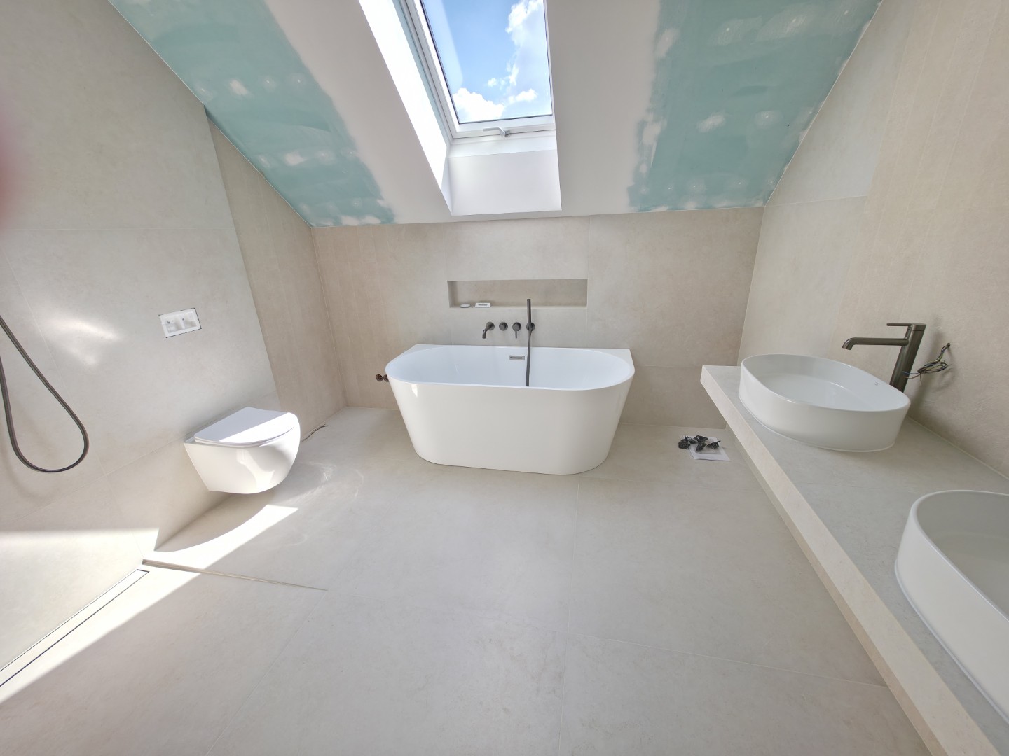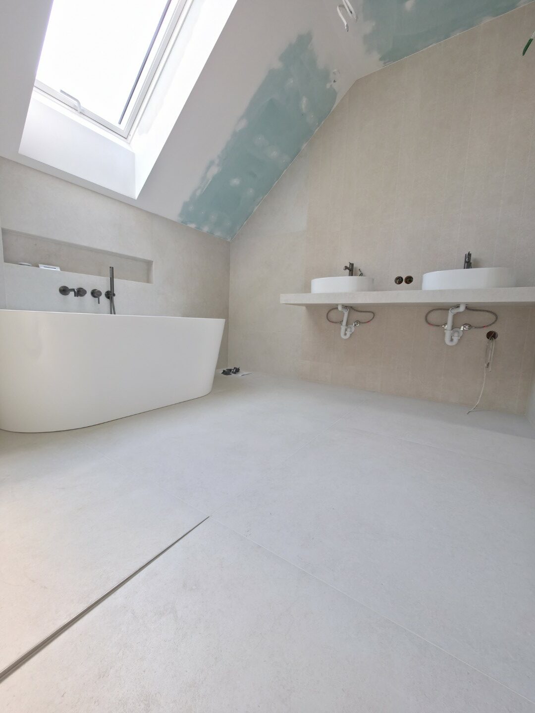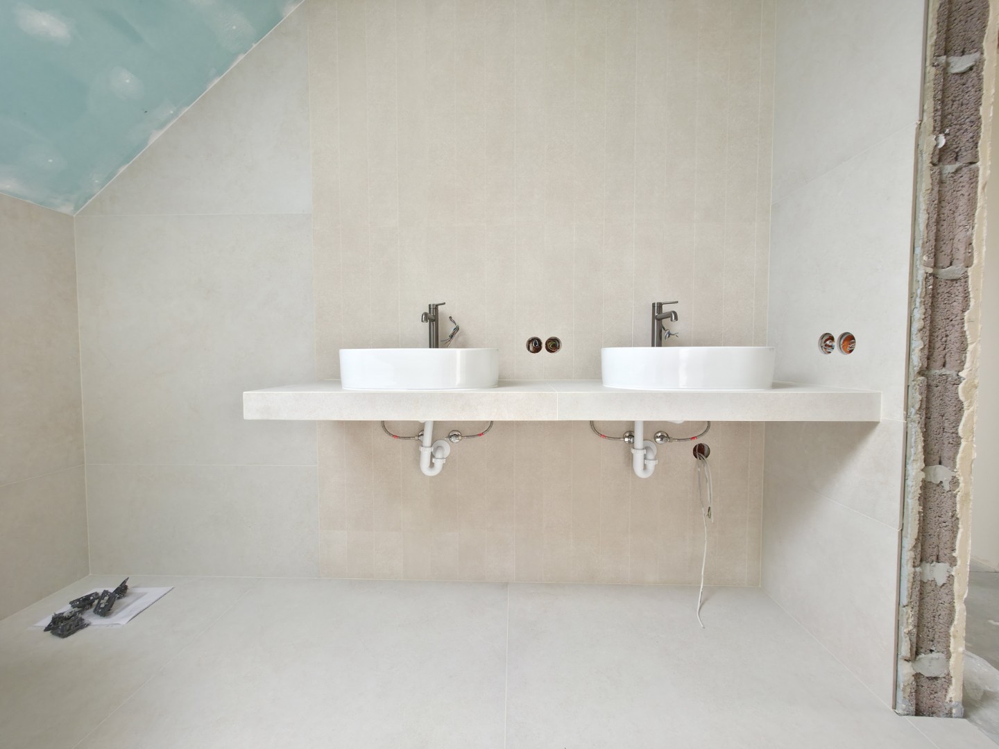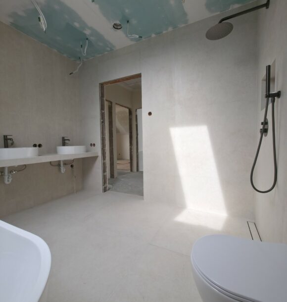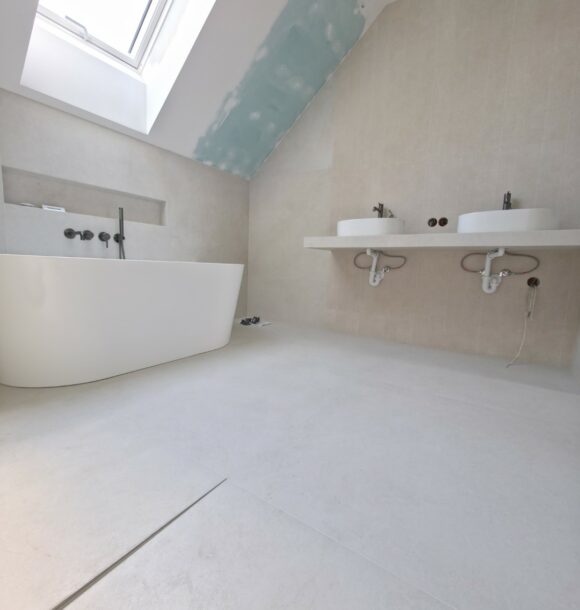 W tym projekcie zrezygnowaliśmy z gotowych mebli na rzecz rozwiązania „szytego na miarę”. Wykonaliśmy podwieszany blat pod dwie umywalki w całości z płytek gresowych. Wymagało to perfekcyjnego szlifowania krawędzi pod kątem 45 stopni (gierowanie), aby uzyskać efekt pełnej bryły kamienia bez widocznych łączeń.