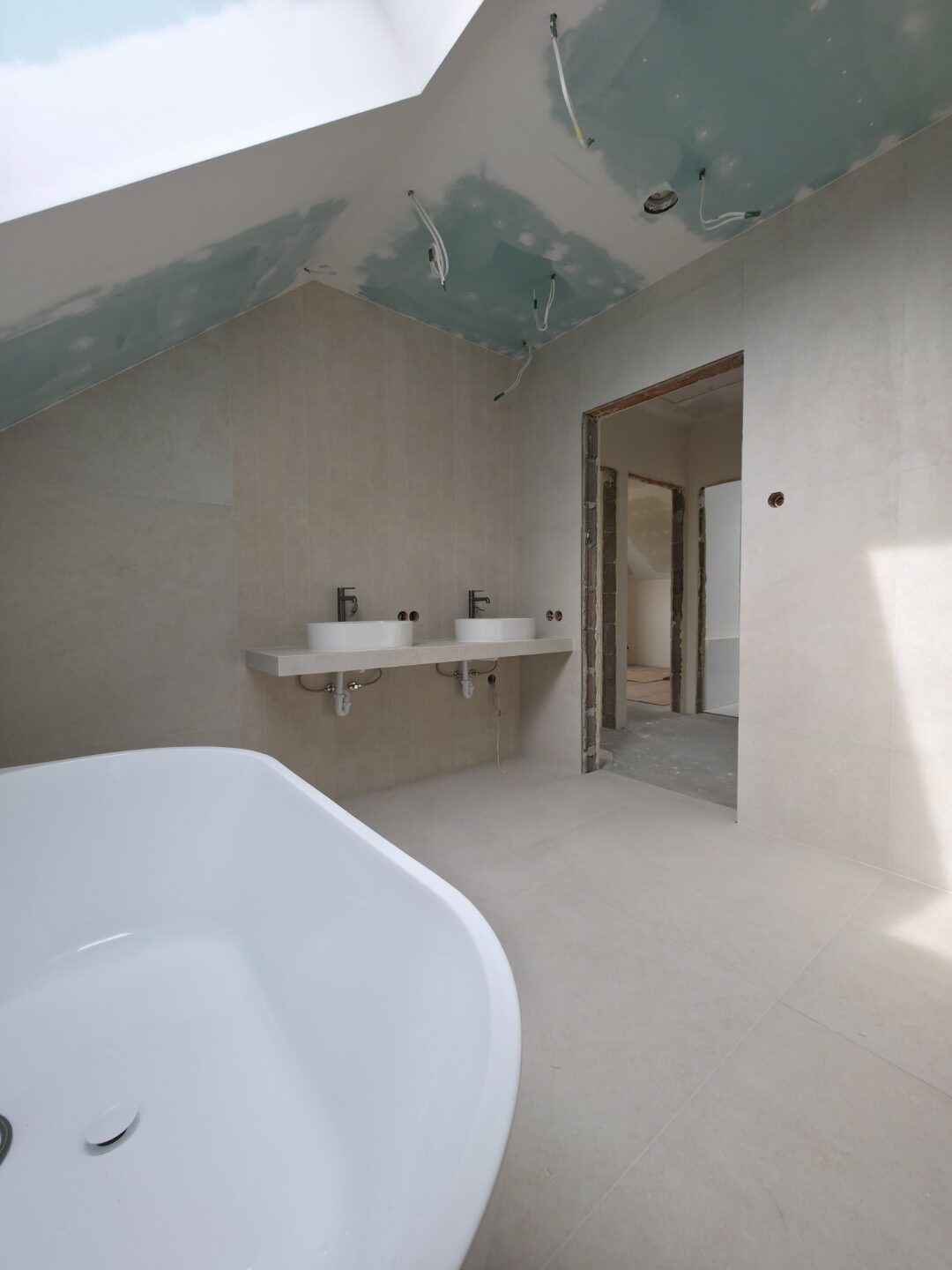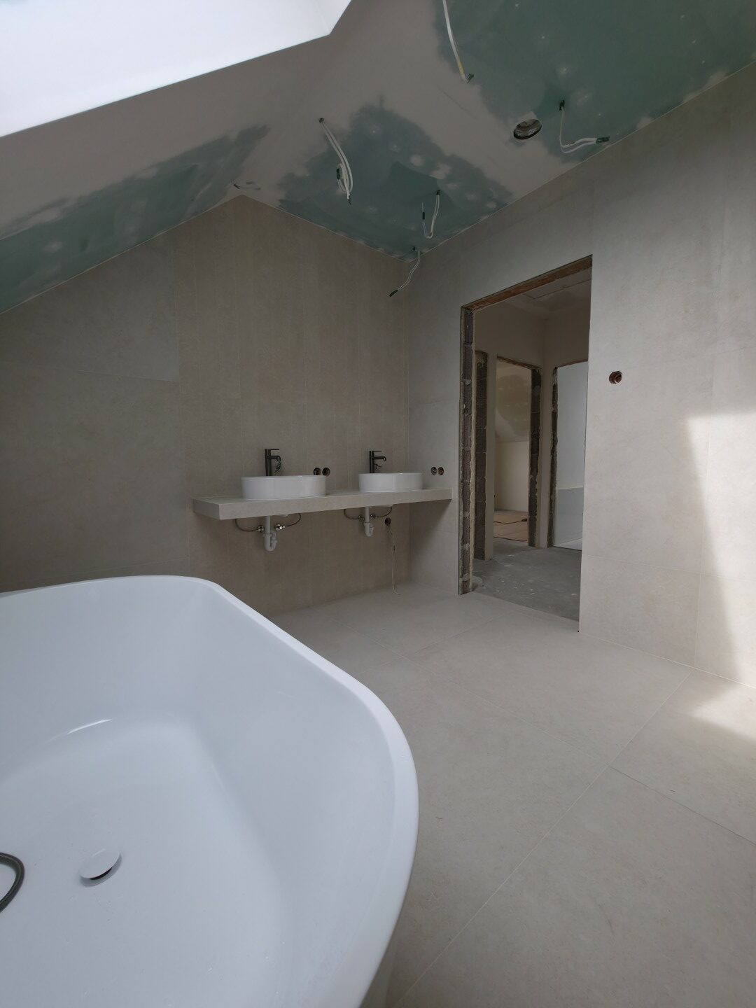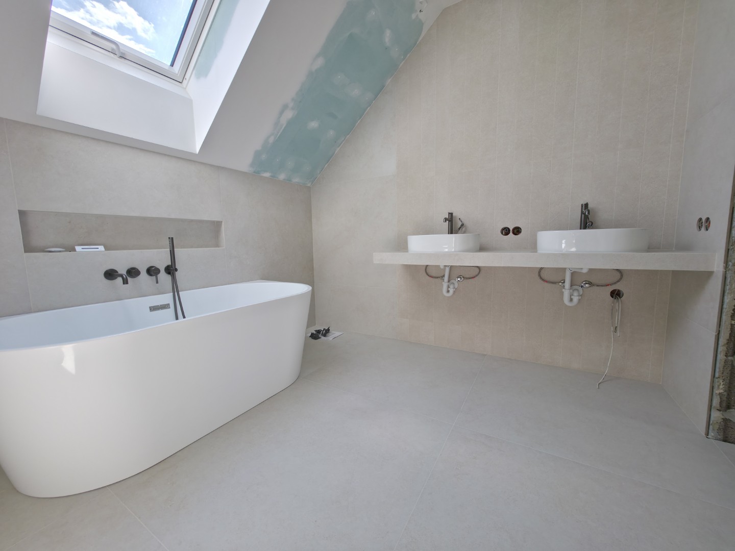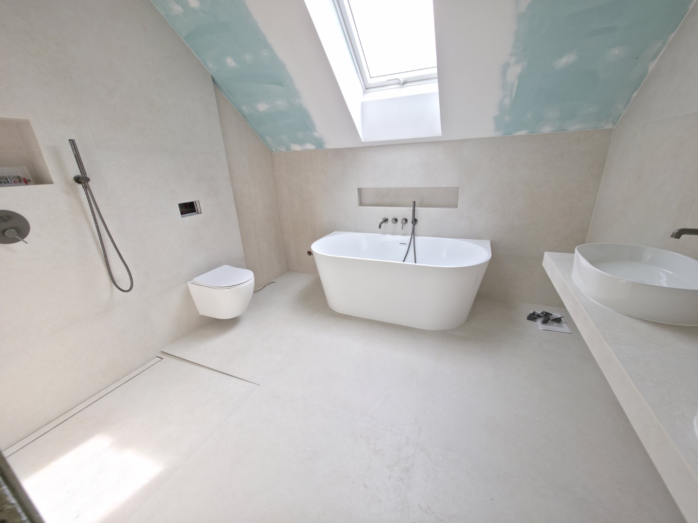 W tym projekcie zrezygnowaliśmy z gotowych mebli na rzecz rozwiązania „szytego na miarę”. Wykonaliśmy podwieszany blat pod dwie umywalki w całości z płytek gresowych. Wymagało to perfekcyjnego szlifowania krawędzi pod kątem 45 stopni (gierowanie), aby uzyskać efekt pełnej bryły kamienia bez widocznych łączeń.
