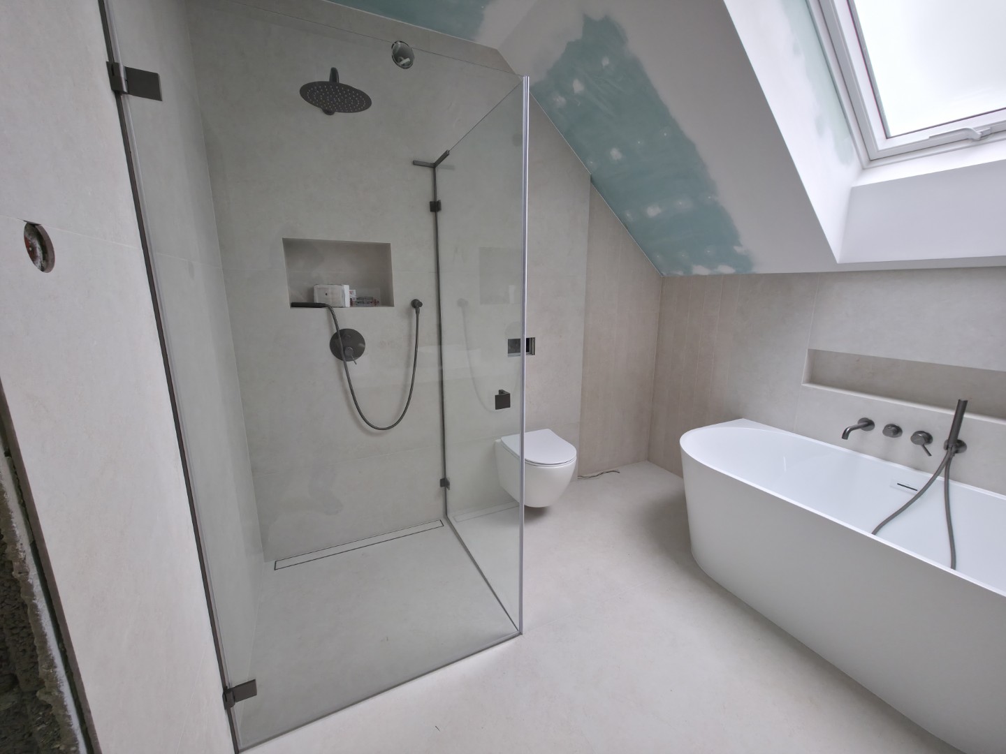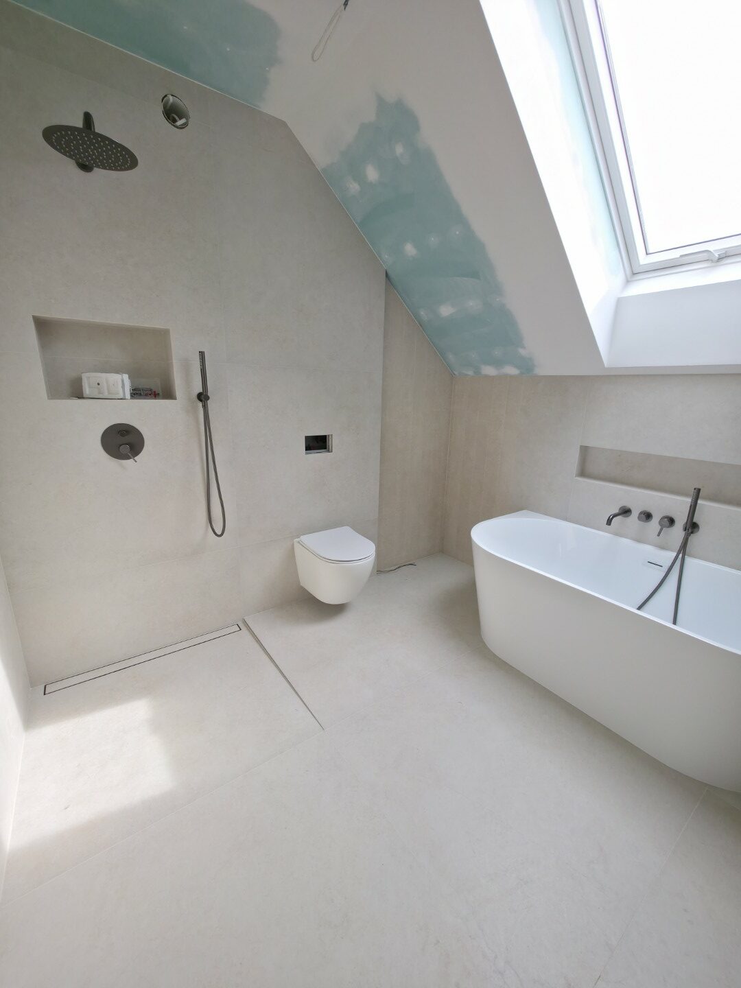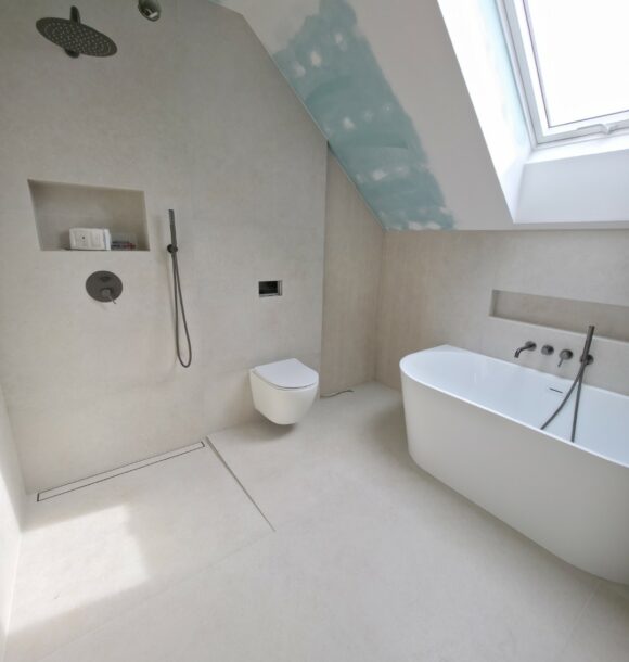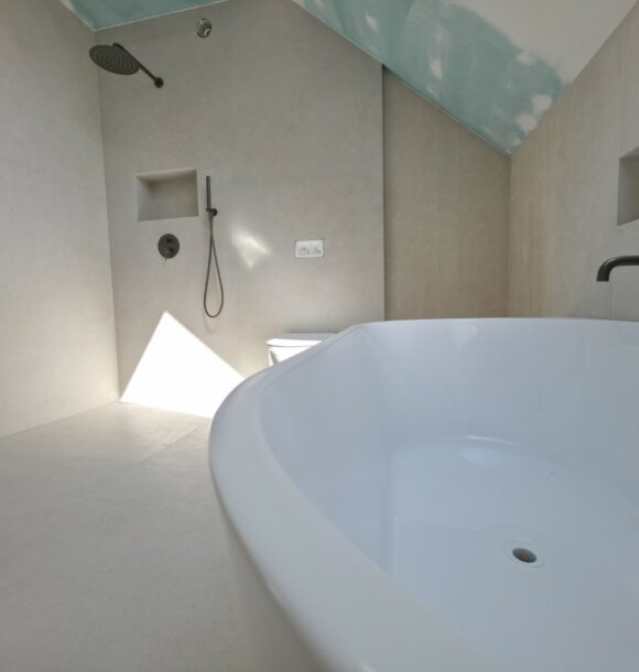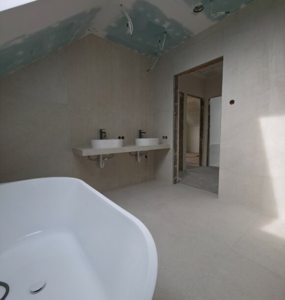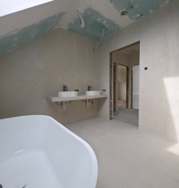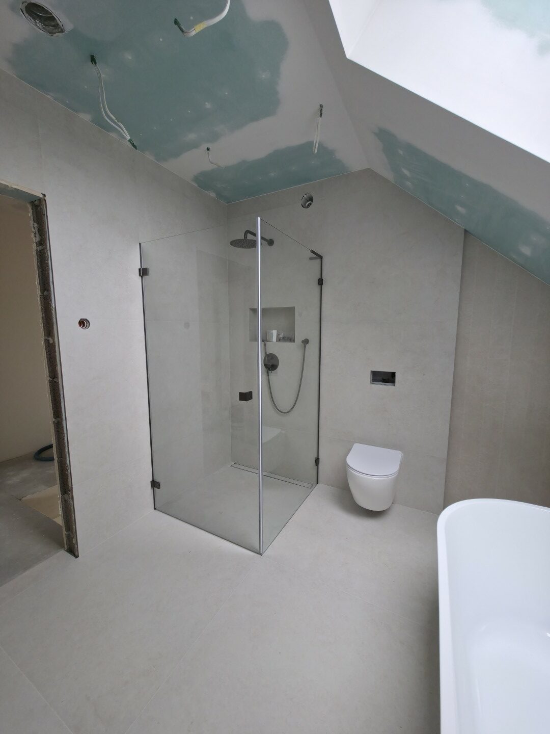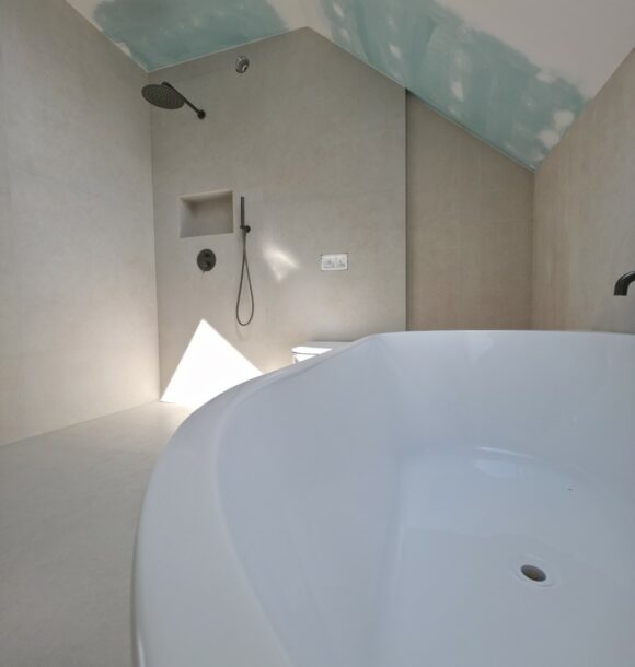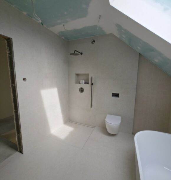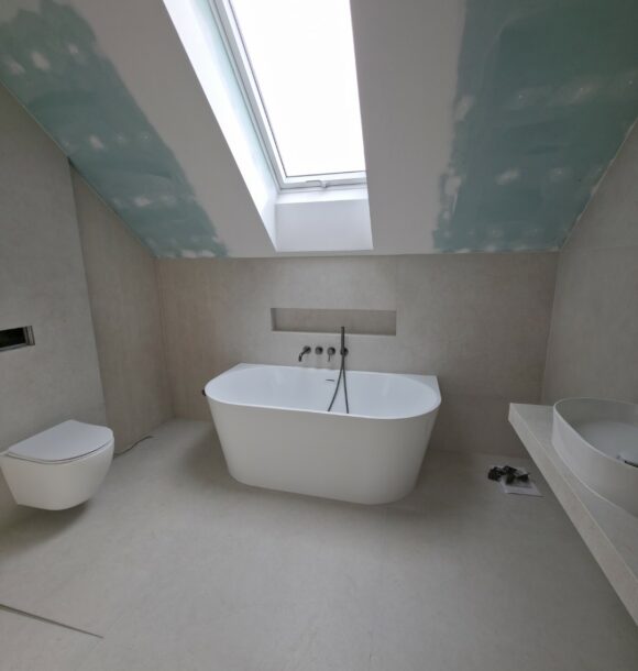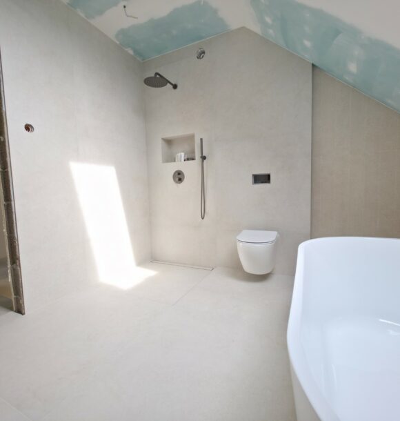 Prezentowana łazienka to pierwsza z czterech realizacji wykonanych w sąsiadujących domach w Hałcnowie. Przejęliśmy obiekt w stanie deweloperskim, co pozwoliło nam od podstaw ukształtować przestrzeń. Kluczowym elementem konstrukcyjnym było wykonanie nowej zabudowy ściany, która ukryła systemy podtynkowe WC oraz stworzyła funkcjonalną wnękę w strefie prysznica.