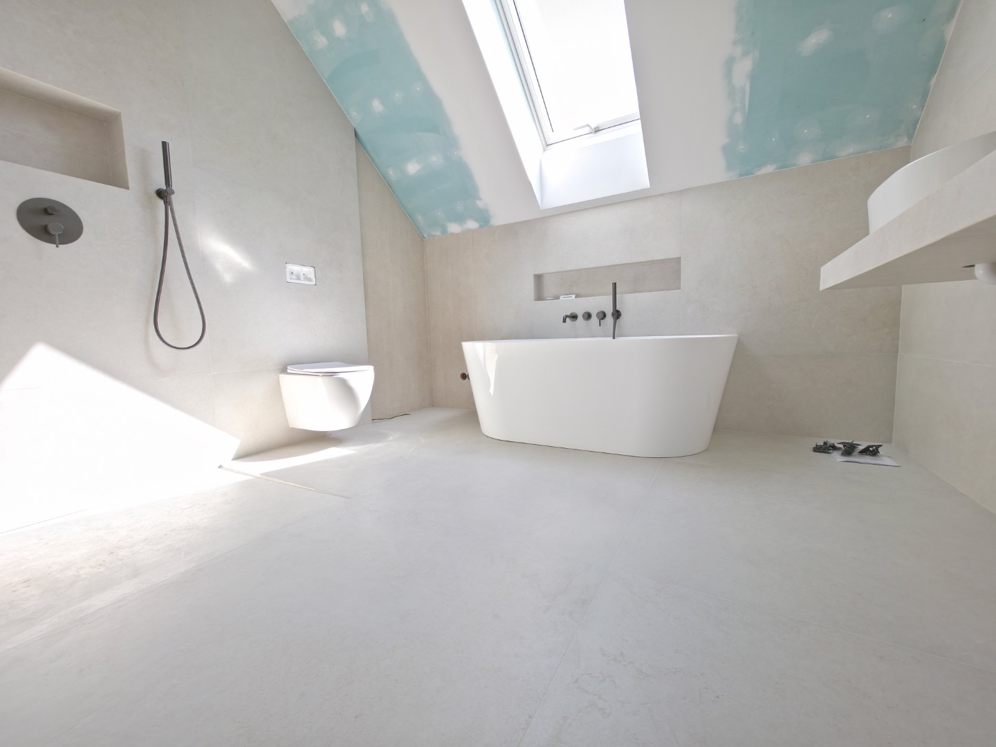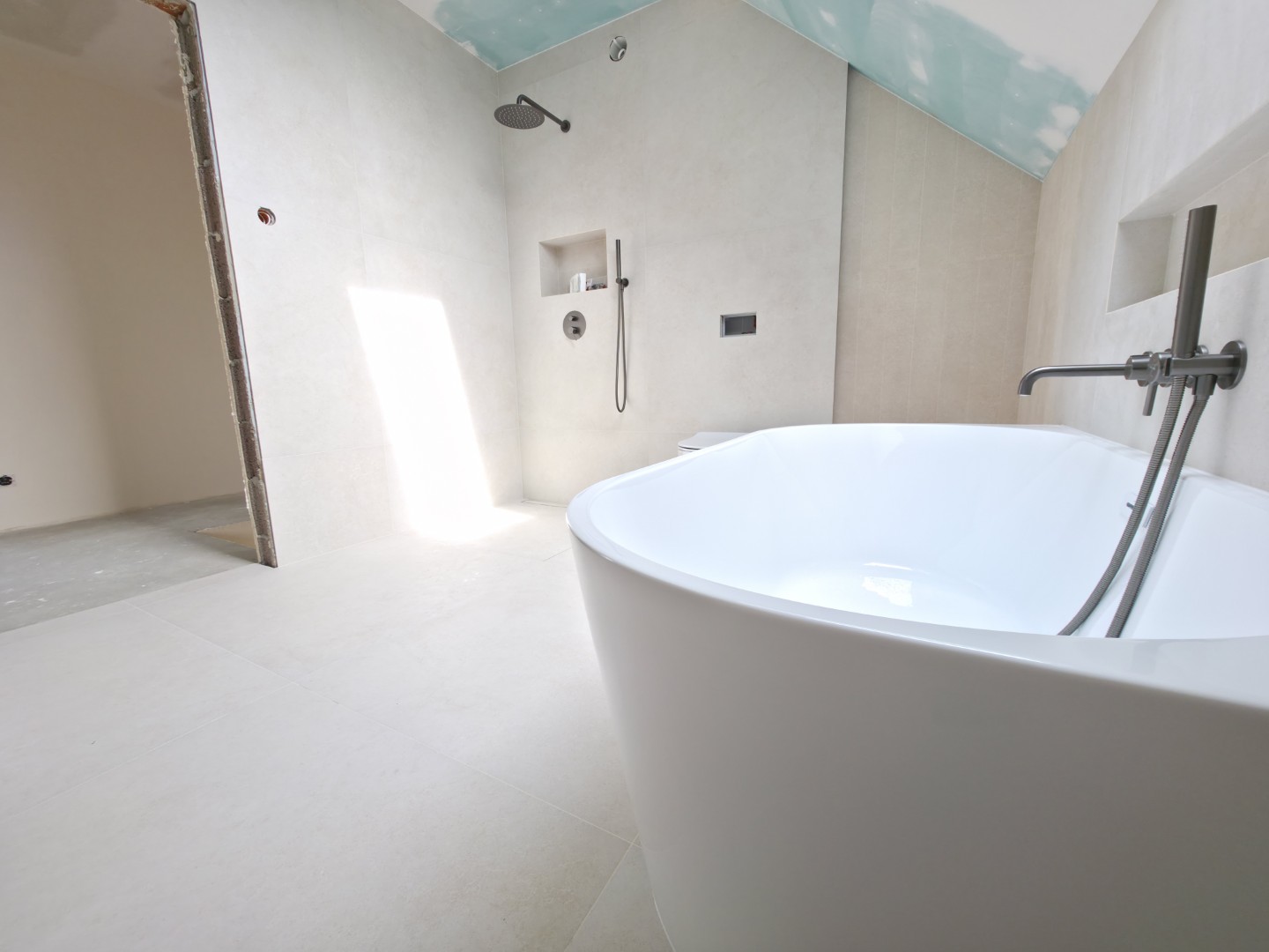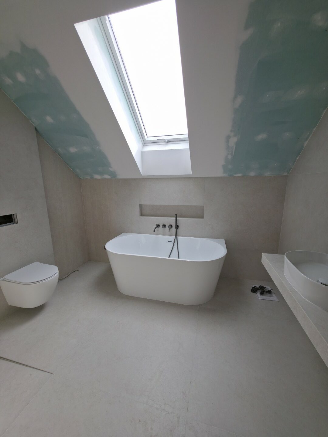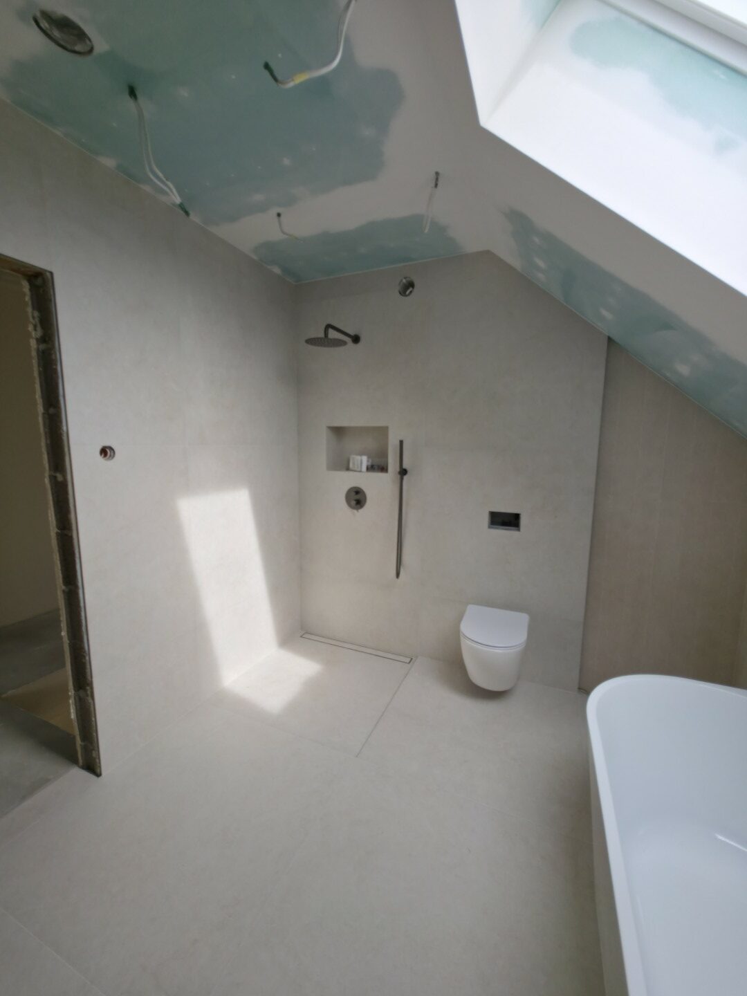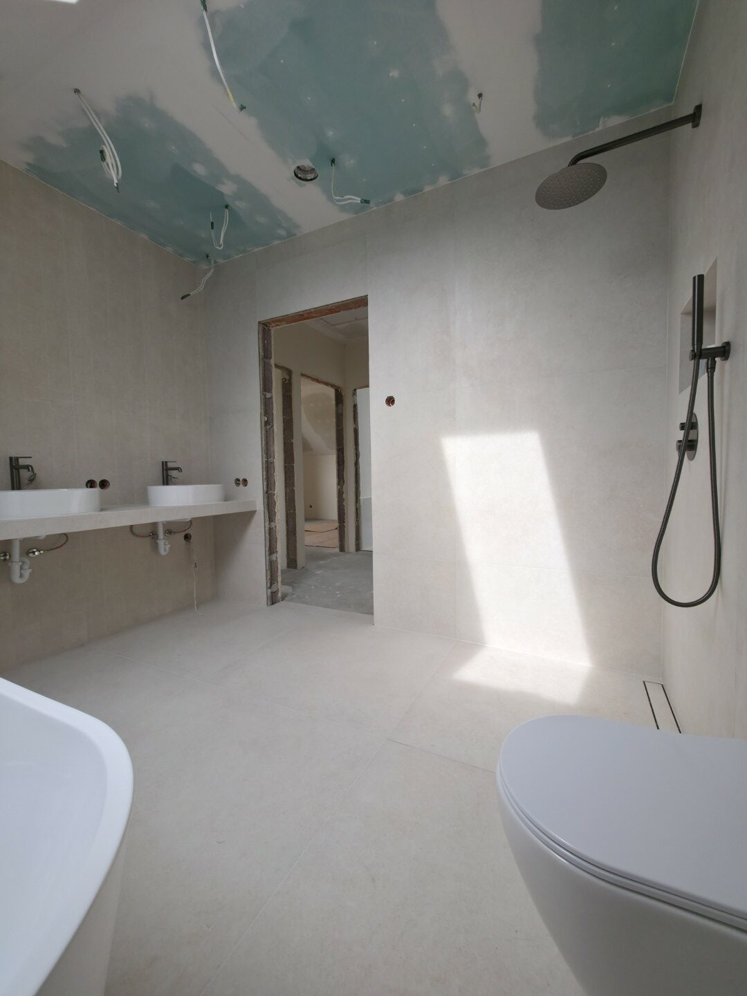 Prezentowana łazienka to pierwsza z czterech realizacji wykonanych w sąsiadujących domach w Hałcnowie. Przejęliśmy obiekt w stanie deweloperskim, co pozwoliło nam od podstaw ukształtować przestrzeń. Kluczowym elementem konstrukcyjnym było wykonanie nowej zabudowy ściany, która ukryła systemy podtynkowe WC oraz stworzyła funkcjonalną wnękę w strefie prysznica.