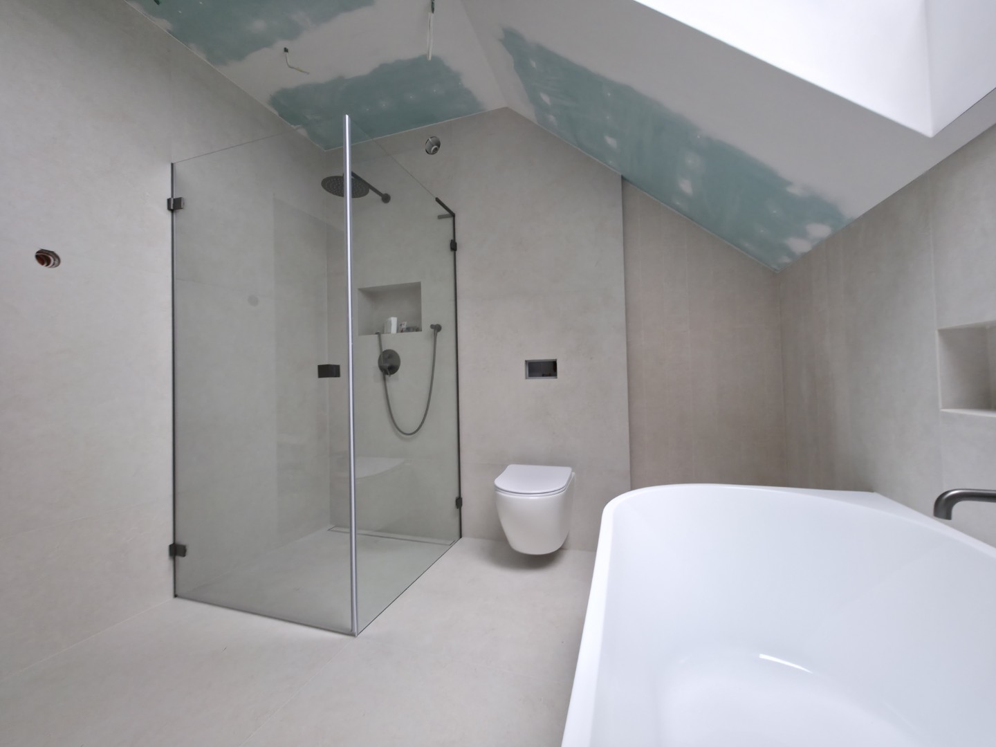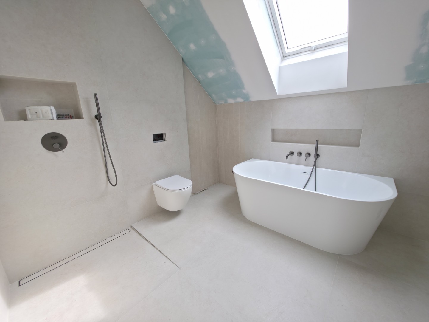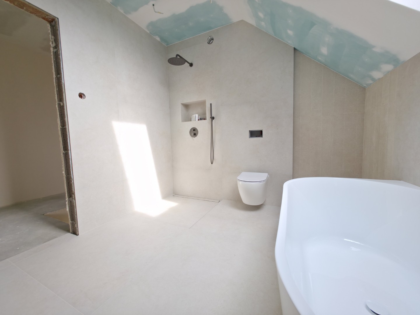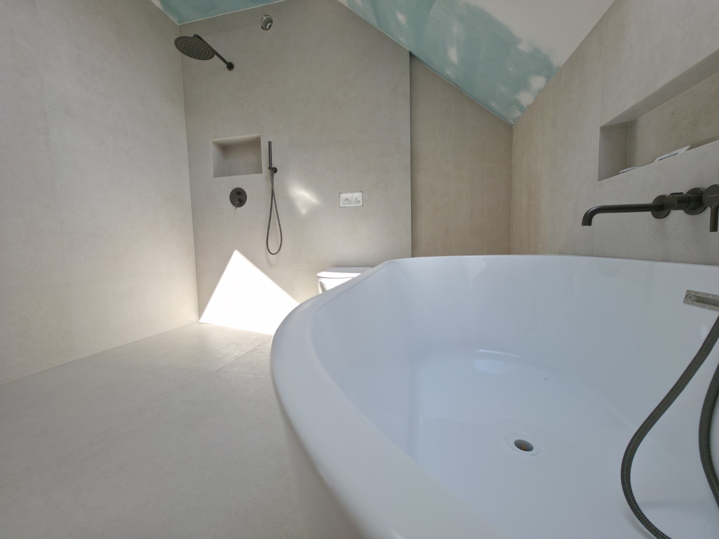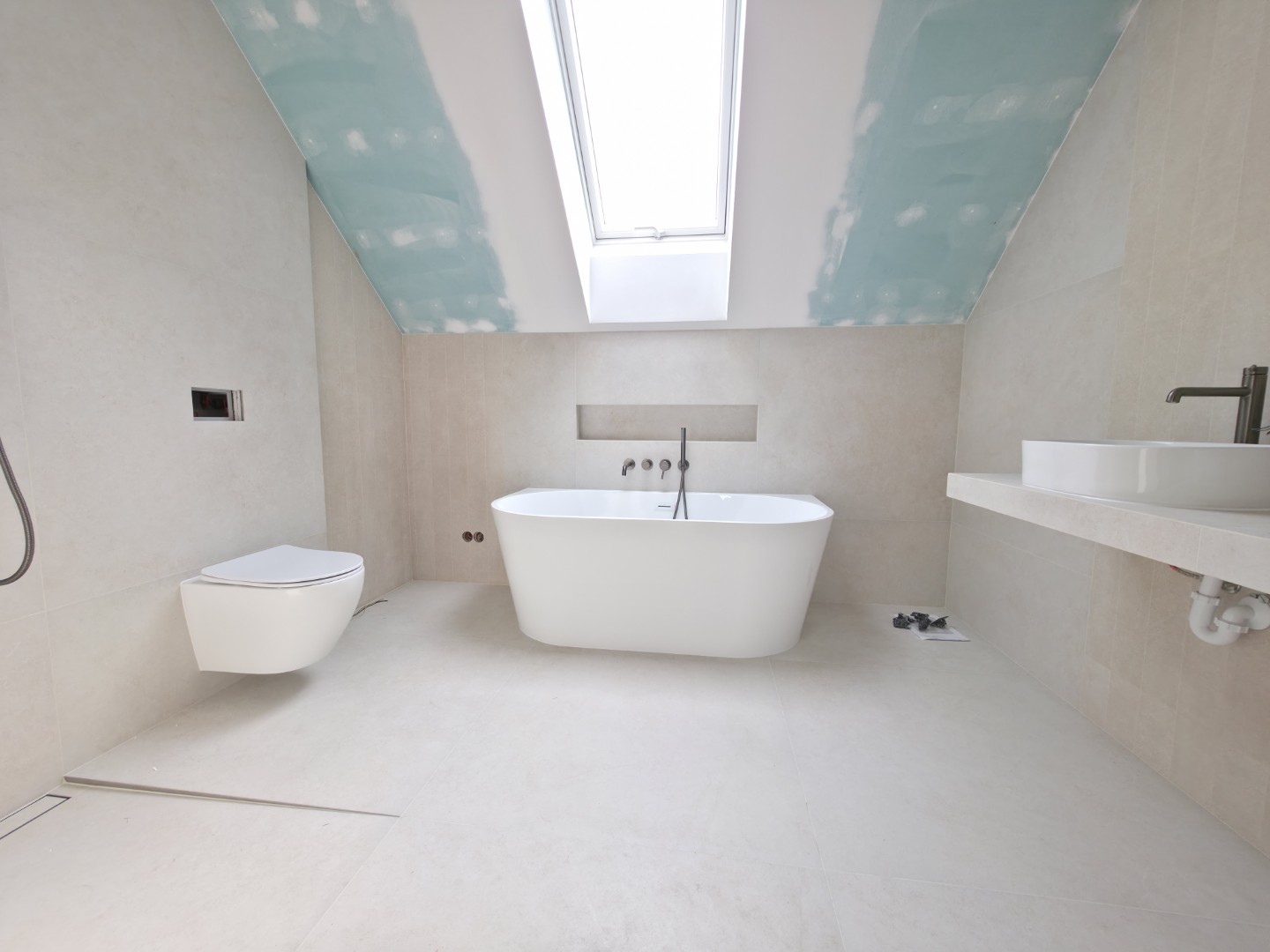 Prezentowana łazienka to pierwsza z czterech realizacji wykonanych w sąsiadujących domach w Hałcnowie. Przejęliśmy obiekt w stanie deweloperskim, co pozwoliło nam od podstaw ukształtować przestrzeń. Kluczowym elementem konstrukcyjnym było wykonanie nowej zabudowy ściany, która ukryła systemy podtynkowe WC oraz stworzyła funkcjonalną wnękę w strefie prysznica.