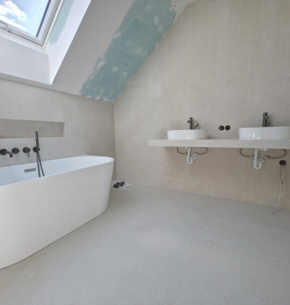 Praca na poddaszu zawsze wymaga większej uwagi ze względu na skosy. Tutaj postawiliśmy na jasny wielki format, który optycznie powiększył przestrzeń pod dachem, tworząc spójny, monolityczny wygląd.