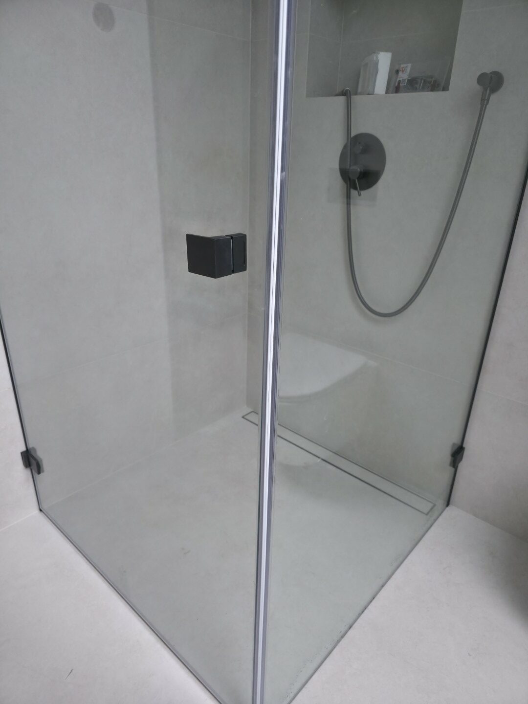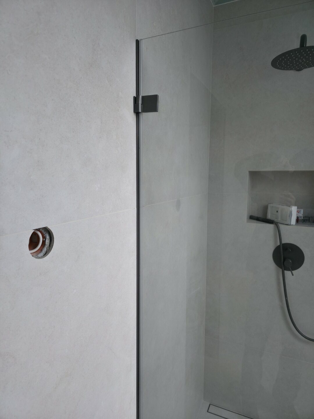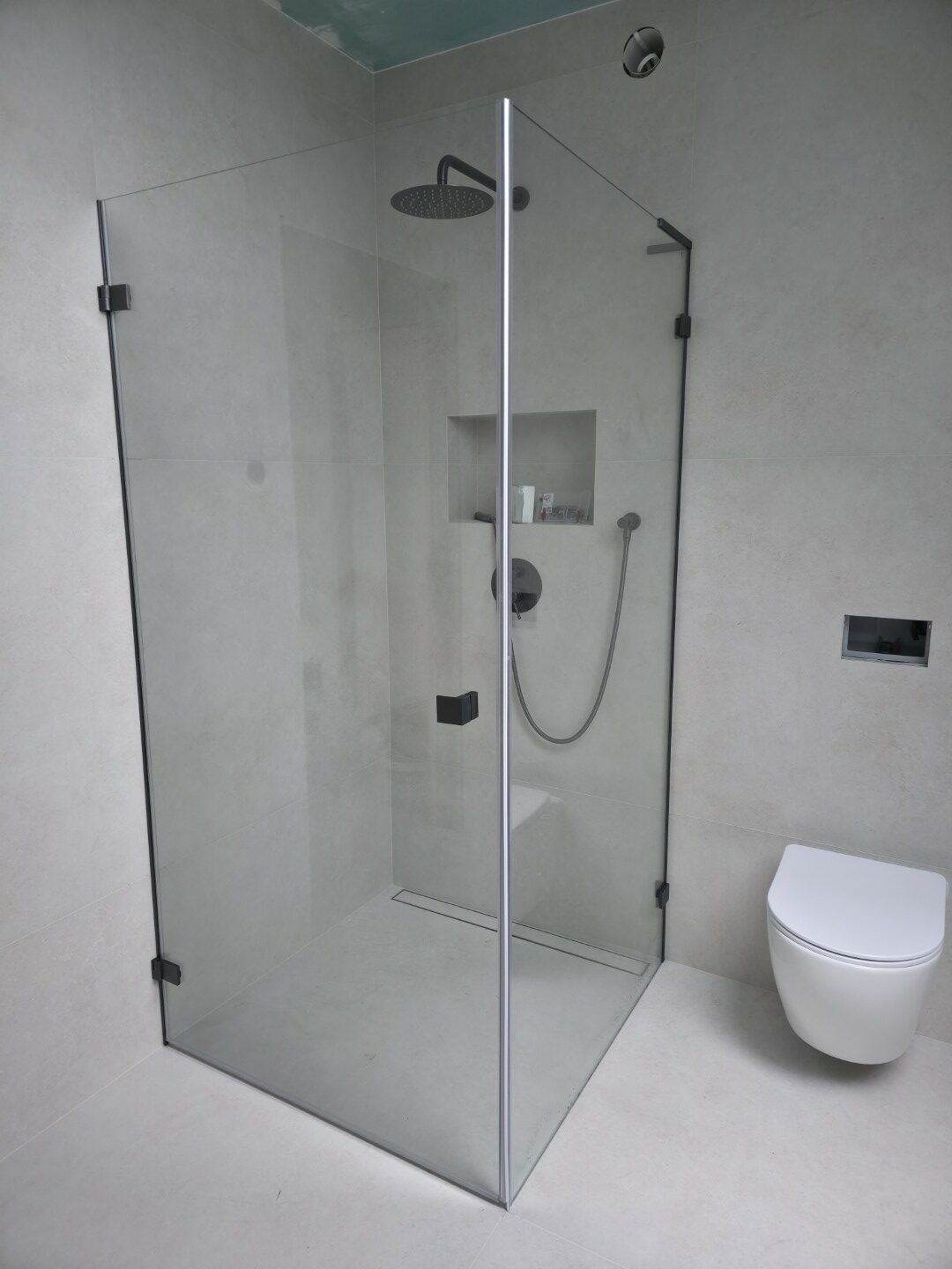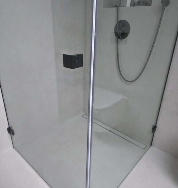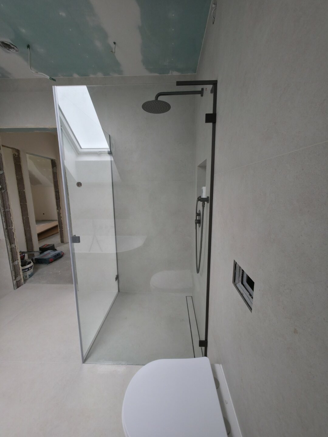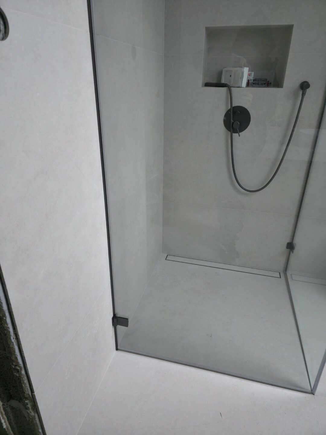 Całość dopełnia odpływ liniowy zintegrowany z posadzką oraz czarna armatura podtynkowa, która kontrastuje z surową fakturą płytki. To realizacja, która łączy inżynierską precyzję montażu z nowoczesnym designem.