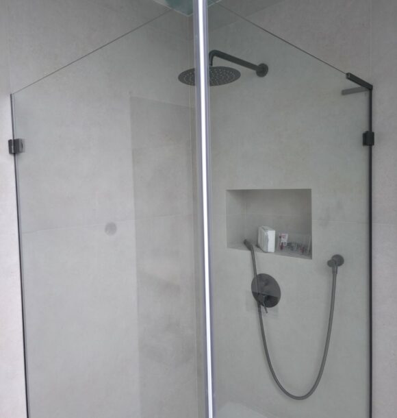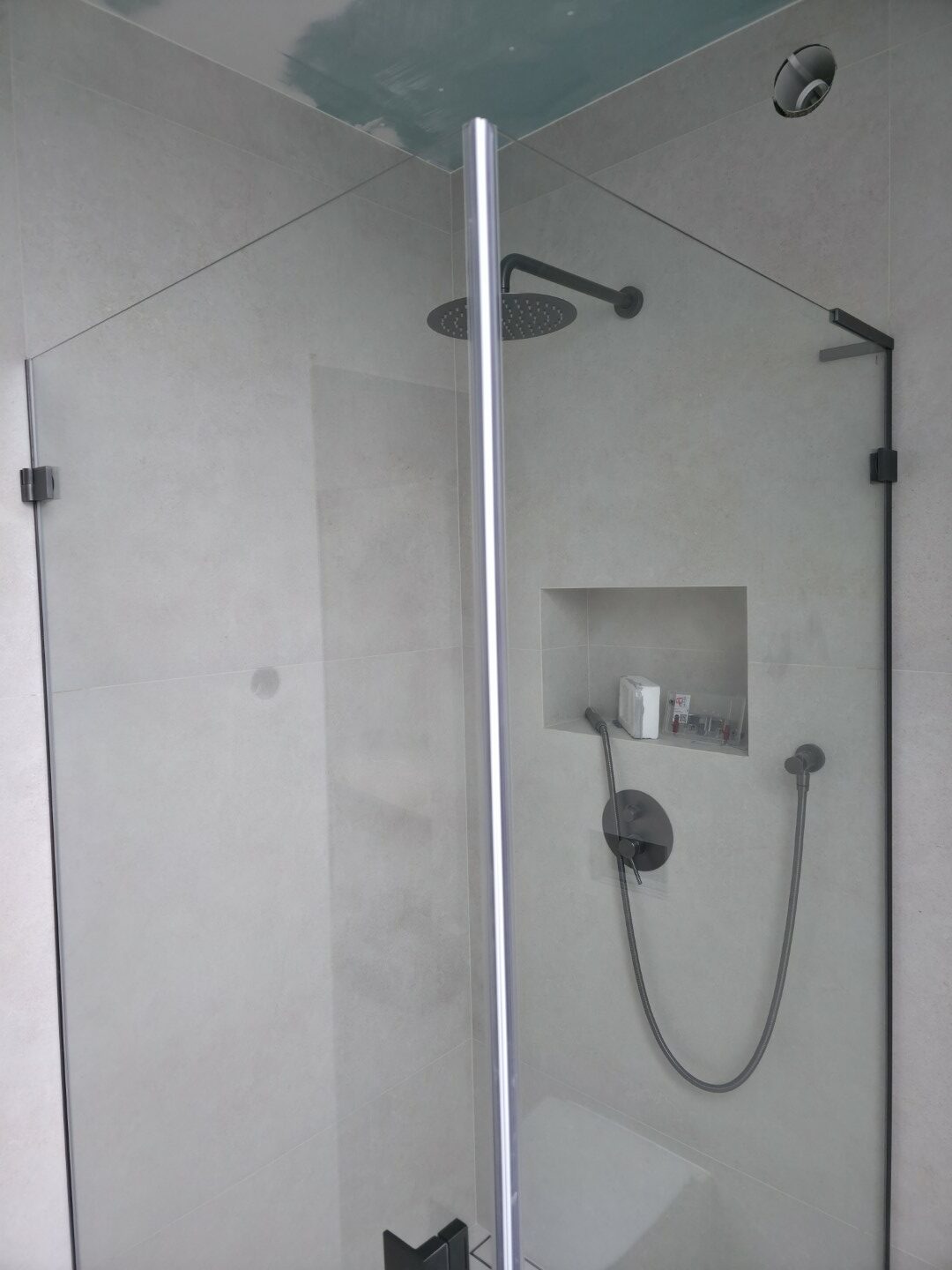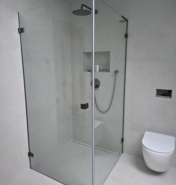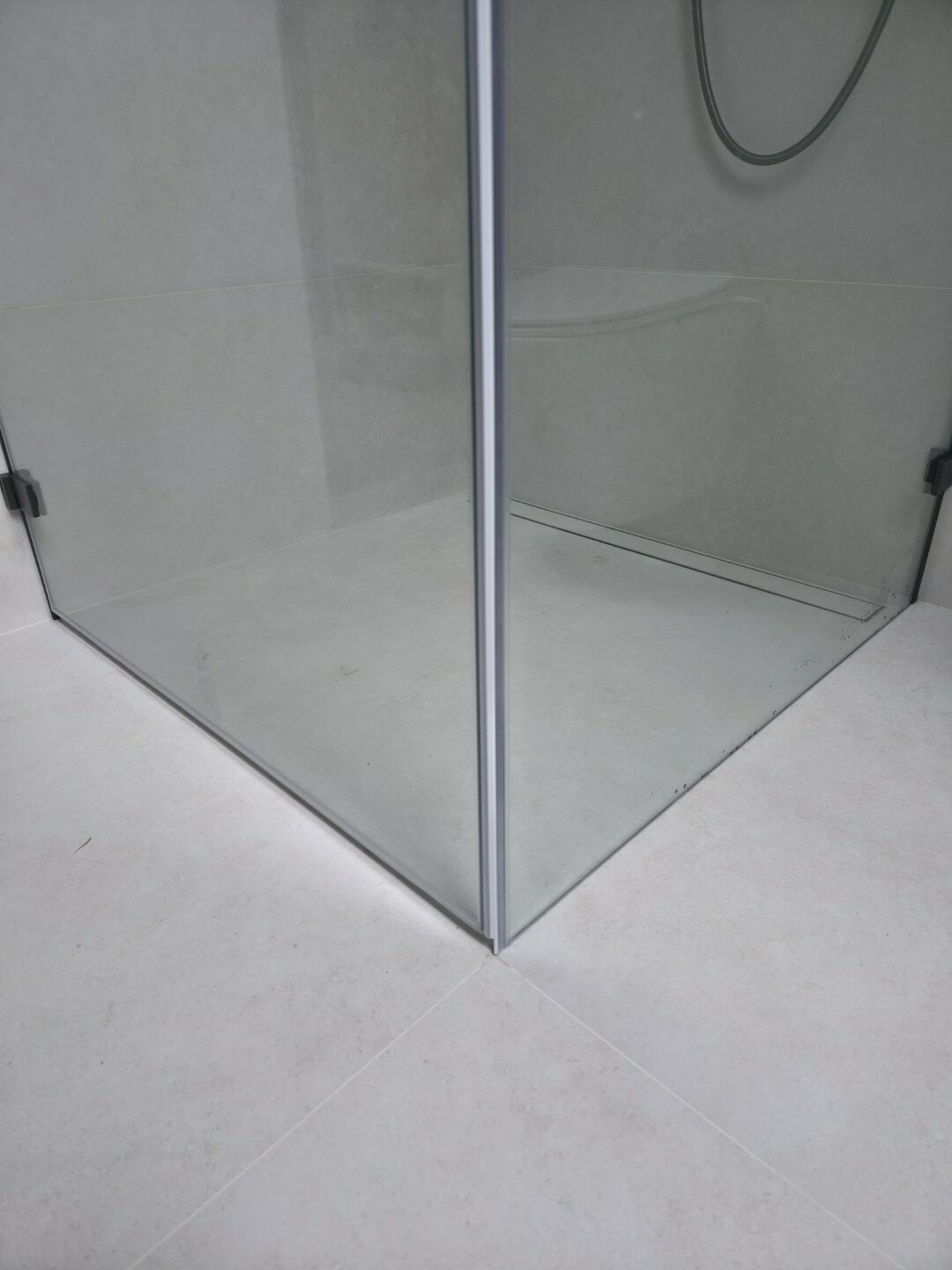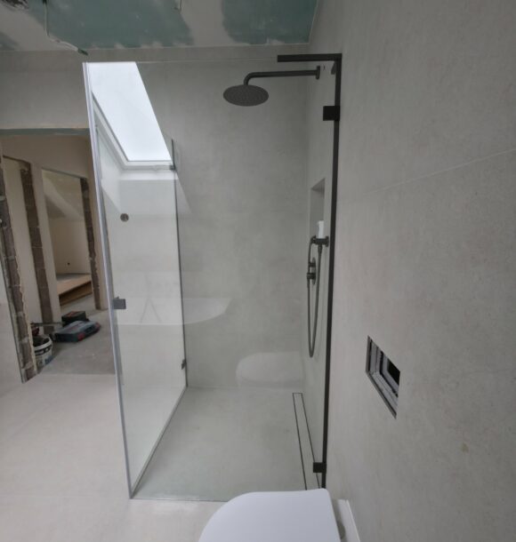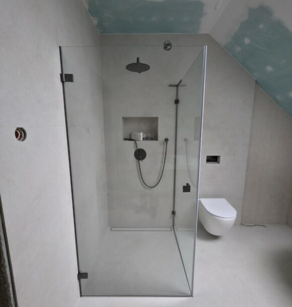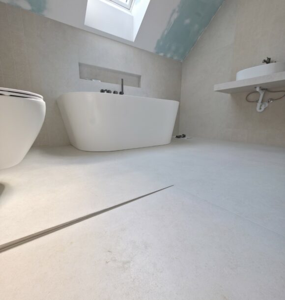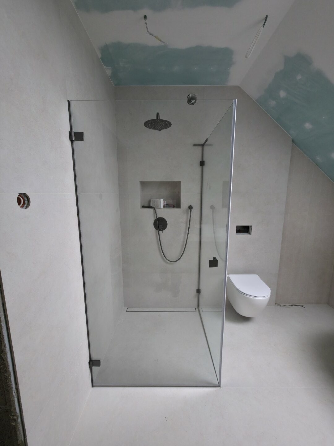 Całość dopełnia odpływ liniowy zintegrowany z posadzką oraz czarna armatura podtynkowa, która kontrastuje z surową fakturą płytki. To realizacja, która łączy inżynierską precyzję montażu z nowoczesnym designem.