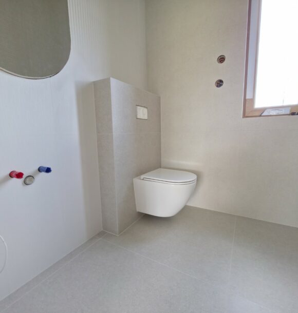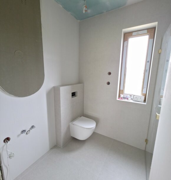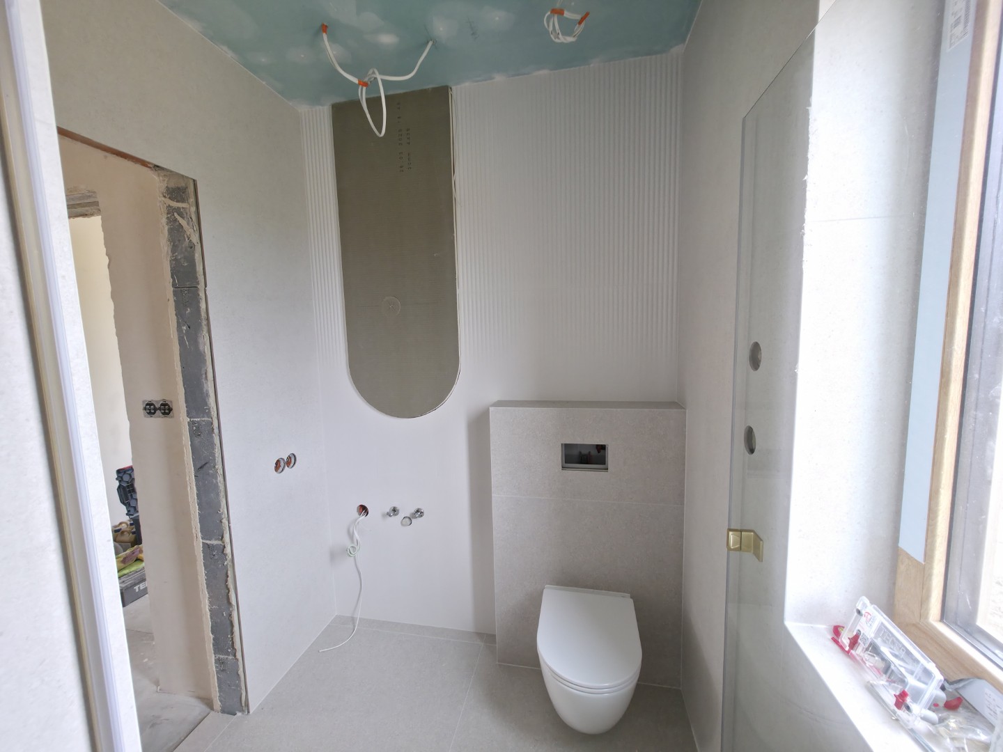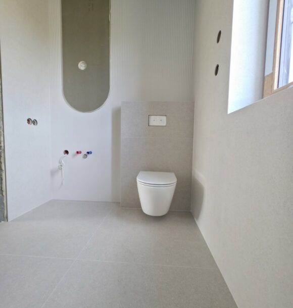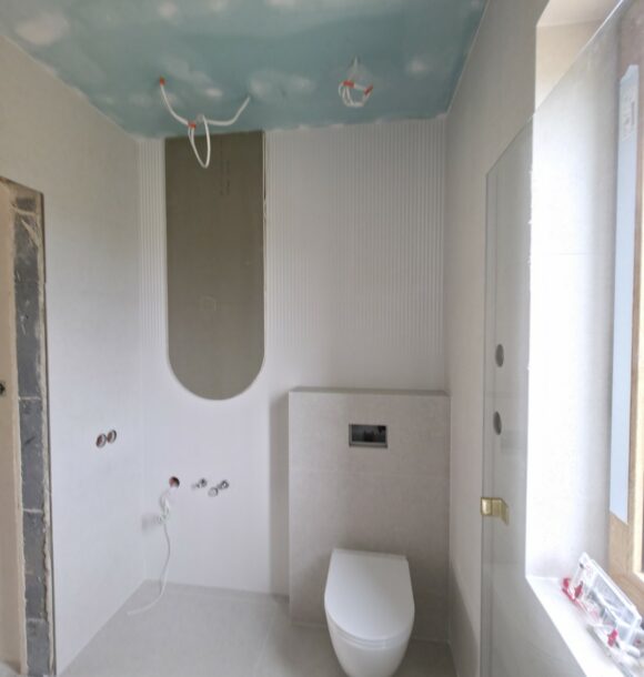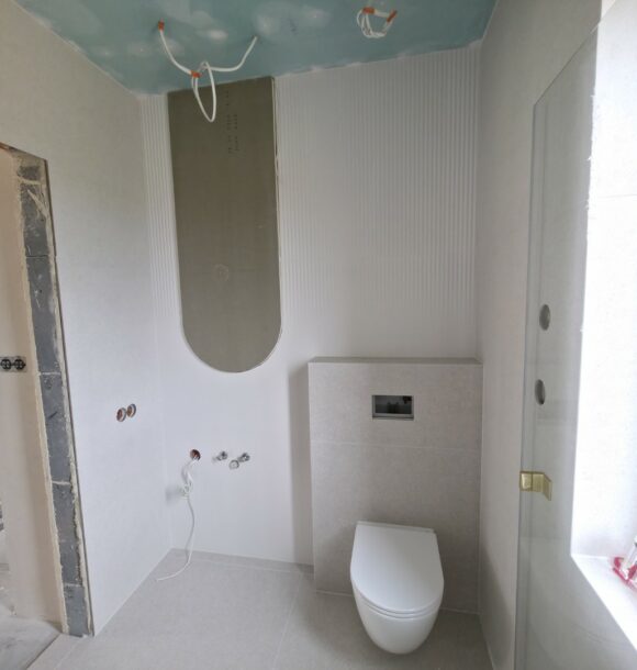 Projekt wymagał też precyzyjnego przygotowania ścian pod konkretne wyposażenie jeszcze na etapie „brudnym”. Ściana umywalkowa została wykończona białą płytką strukturalną (dekor) i przygotowana pod montaż nietypowego lustra z oświetleniem LED i zaokrąglonym dołem. To pokazuje, że myślimy o efekcie końcowym już przy kładzeniu instalacji.