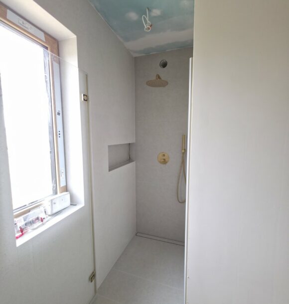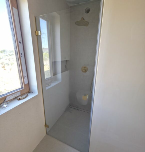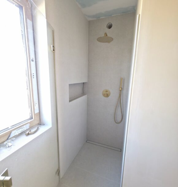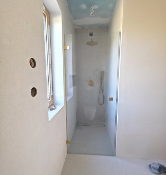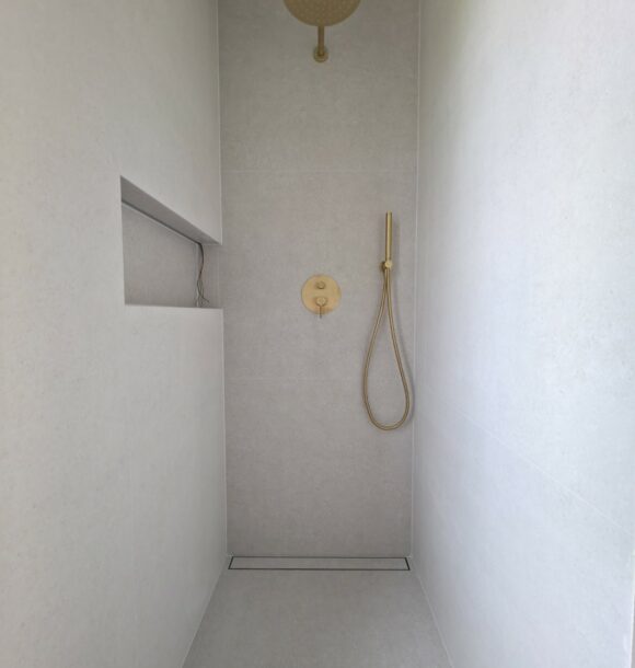 W tej niewielkiej łazience każdy centymetr miał znaczenie. Strefę prysznica zorganizowaliśmy we wnęce, zamykając ją minimalistycznymi drzwiami szklanymi ze złotymi okuciami. Aby nie zaburzać przestrzeni wystającymi półkami, wykuliśmy wnękę na kosmetyki bezpośrednio w ścianie – rozwiązanie trwałe i estetyczne.