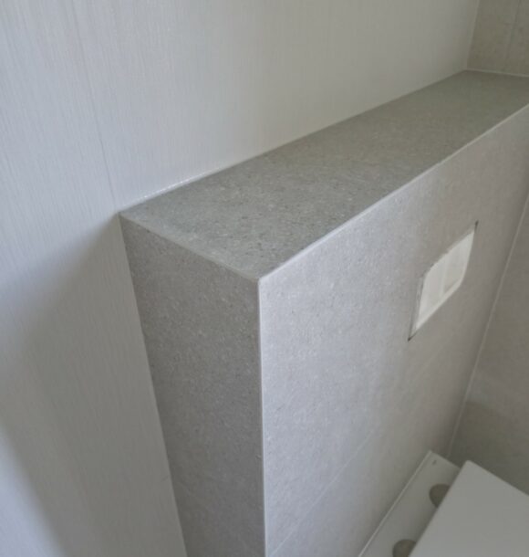 O jakości pracy glazurnika świadczą narożniki. W tym projekcie całkowicie zrezygnowaliśmy z plastikowych czy aluminiowych listew wykończeniowych. Zarówno obudowa stelaża WC, jak i głębokie glify okienne zostały wykonane poprzez szlifowanie płytek wielkoformatowych pod kątem 45 stopni.