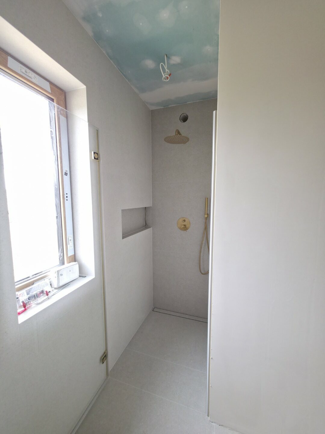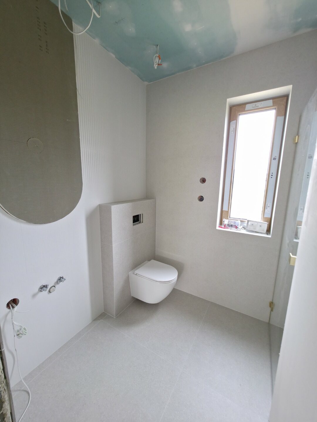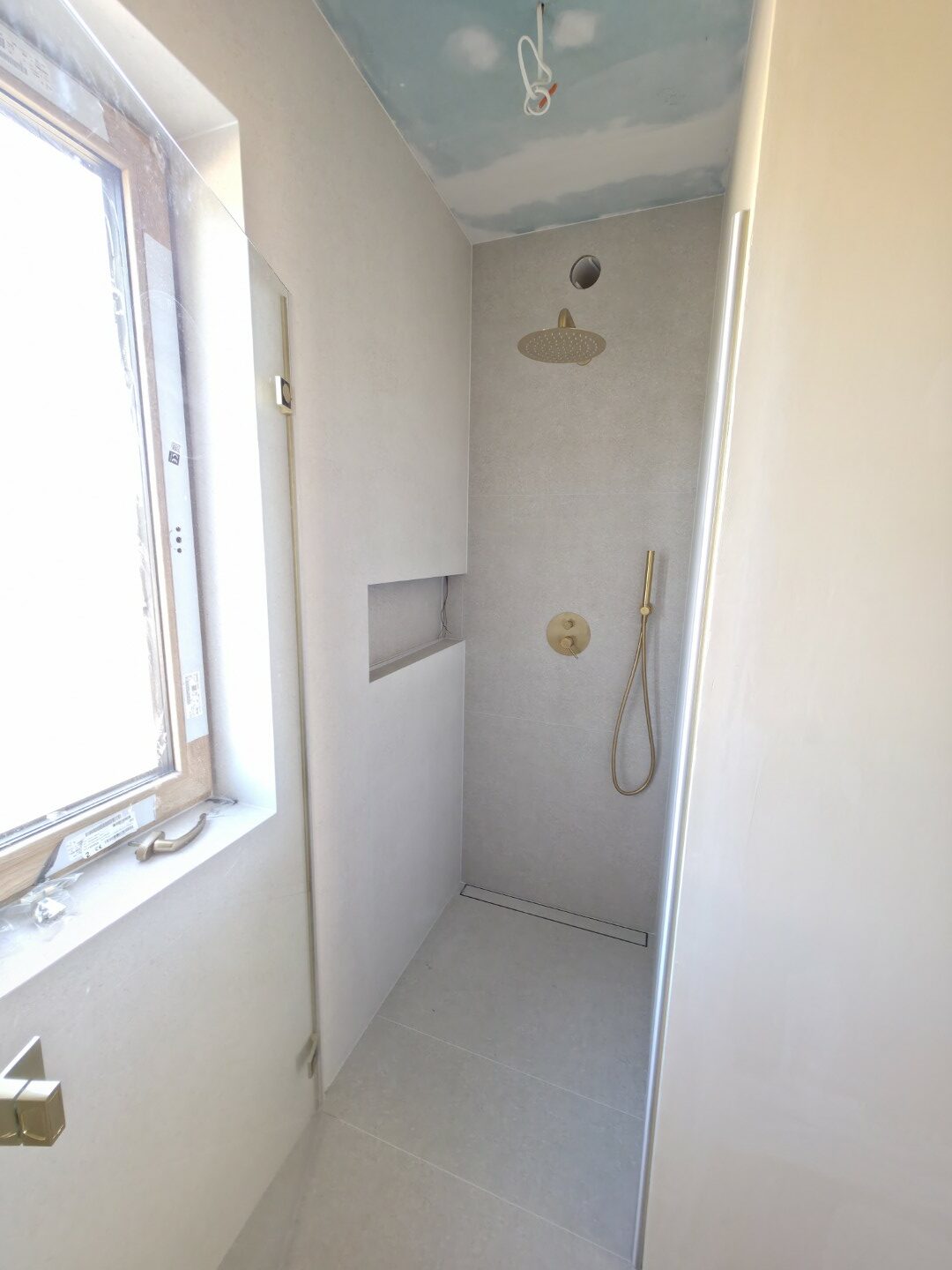 Uzyskanie idealnej, ostrej krawędzi przy oknie i półce nad toaletą wymaga precyzyjnego sprzętu i pewnej ręki, szczególnie przy twardym gresie. Całość dopełnia odpływ liniowy oraz złota armatura szczotkowana, która na tle jasnych płyt buduje luksusowy charakter wnętrza.