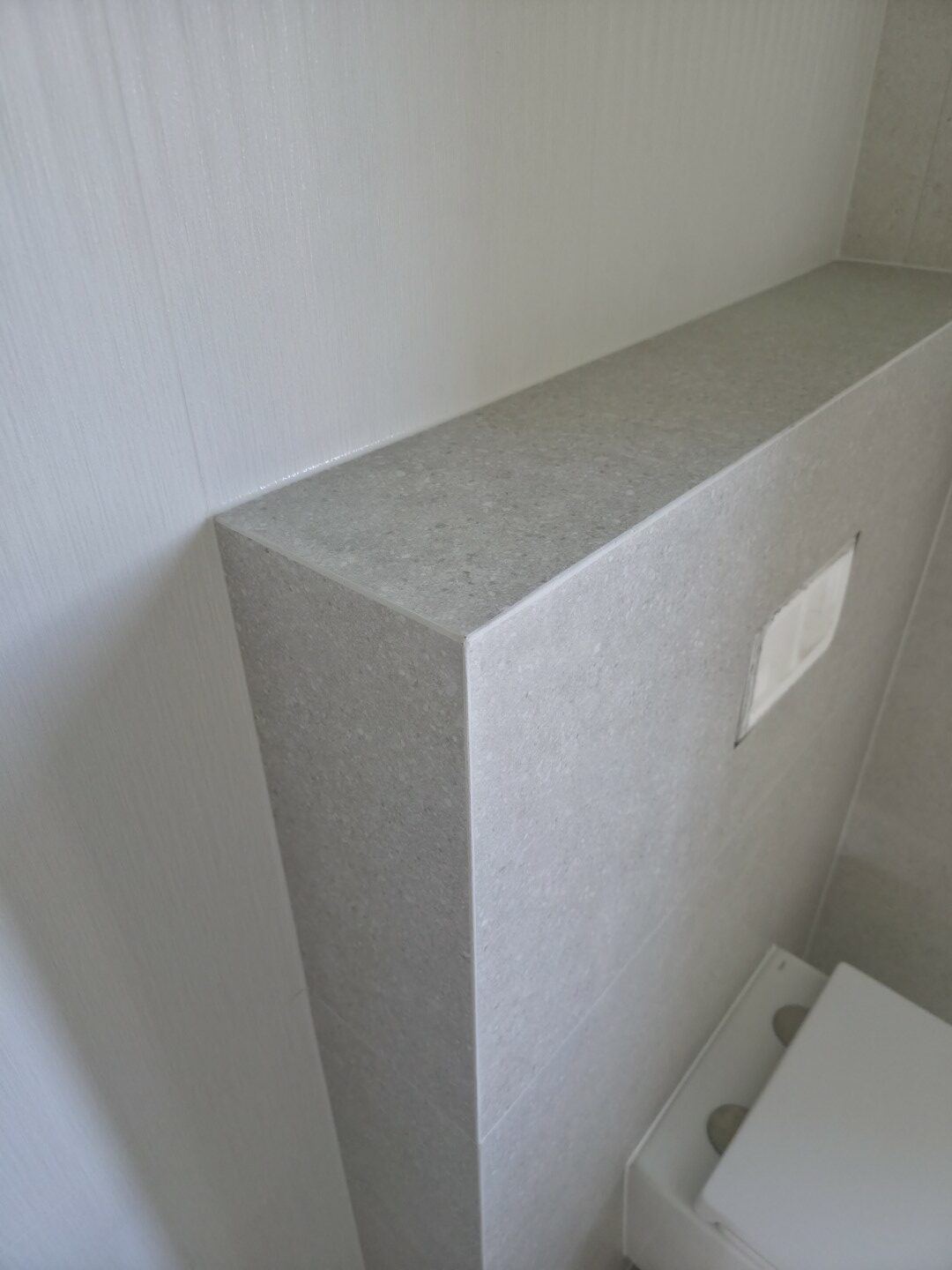 O jakości pracy glazurnika świadczą narożniki. W tym projekcie całkowicie zrezygnowaliśmy z plastikowych czy aluminiowych listew wykończeniowych. Zarówno obudowa stelaża WC, jak i głębokie glify okienne zostały wykonane poprzez szlifowanie płytek wielkoformatowych pod kątem 45 stopni.