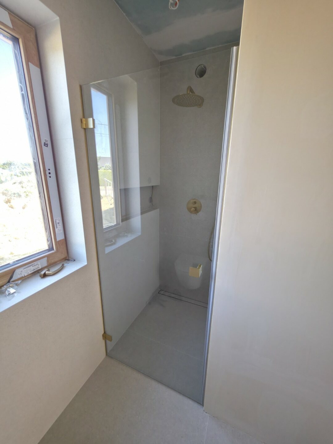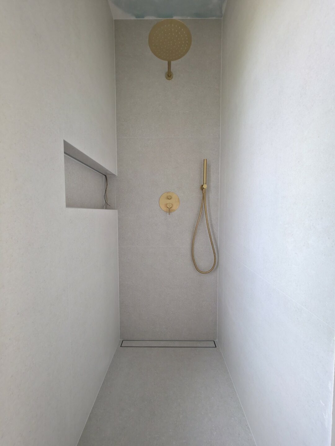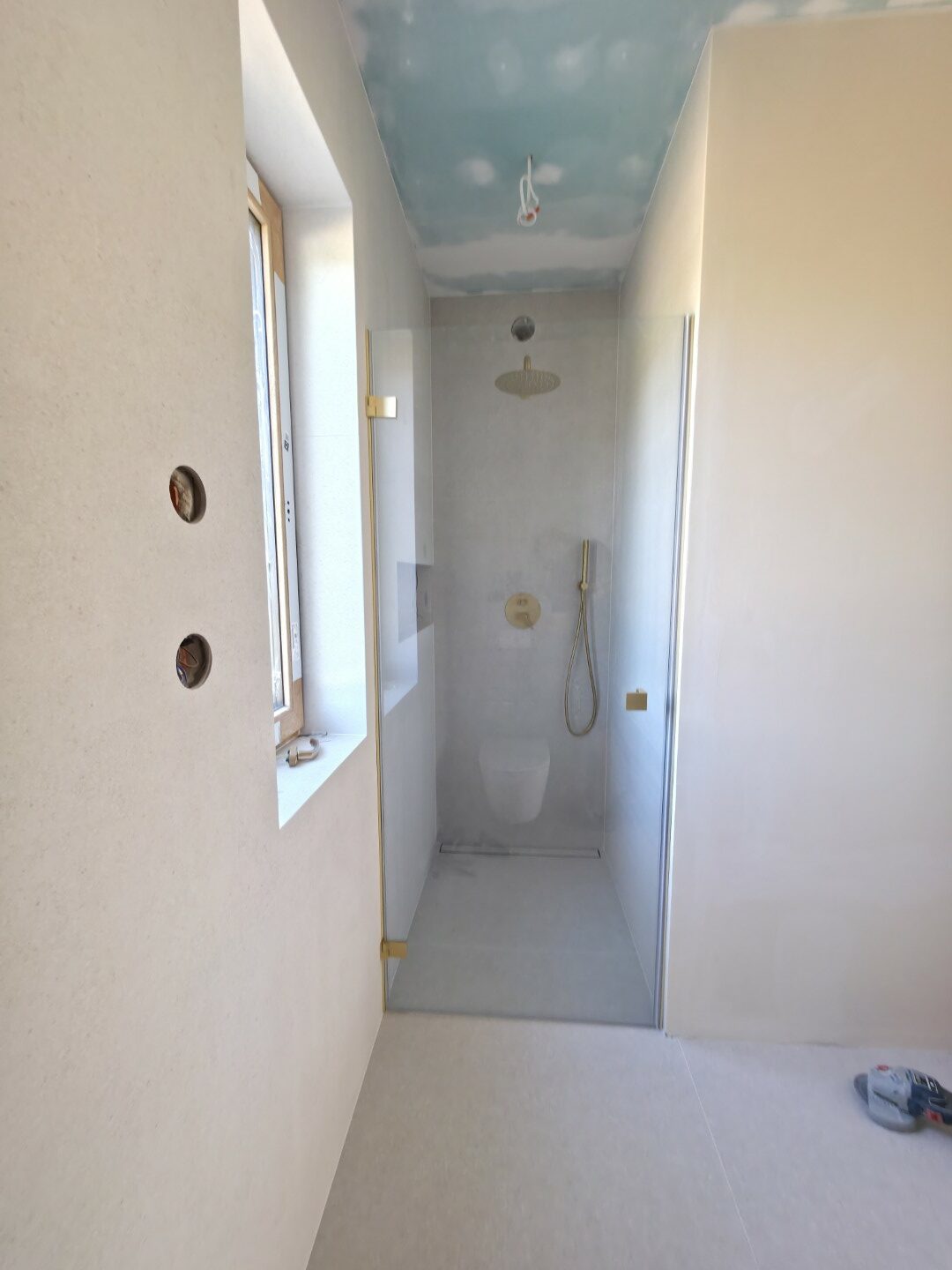 W tej niewielkiej łazience każdy centymetr miał znaczenie. Strefę prysznica zorganizowaliśmy we wnęce, zamykając ją minimalistycznymi drzwiami szklanymi ze złotymi okuciami. Aby nie zaburzać przestrzeni wystającymi półkami, wykuliśmy wnękę na kosmetyki bezpośrednio w ścianie – rozwiązanie trwałe i estetyczne.