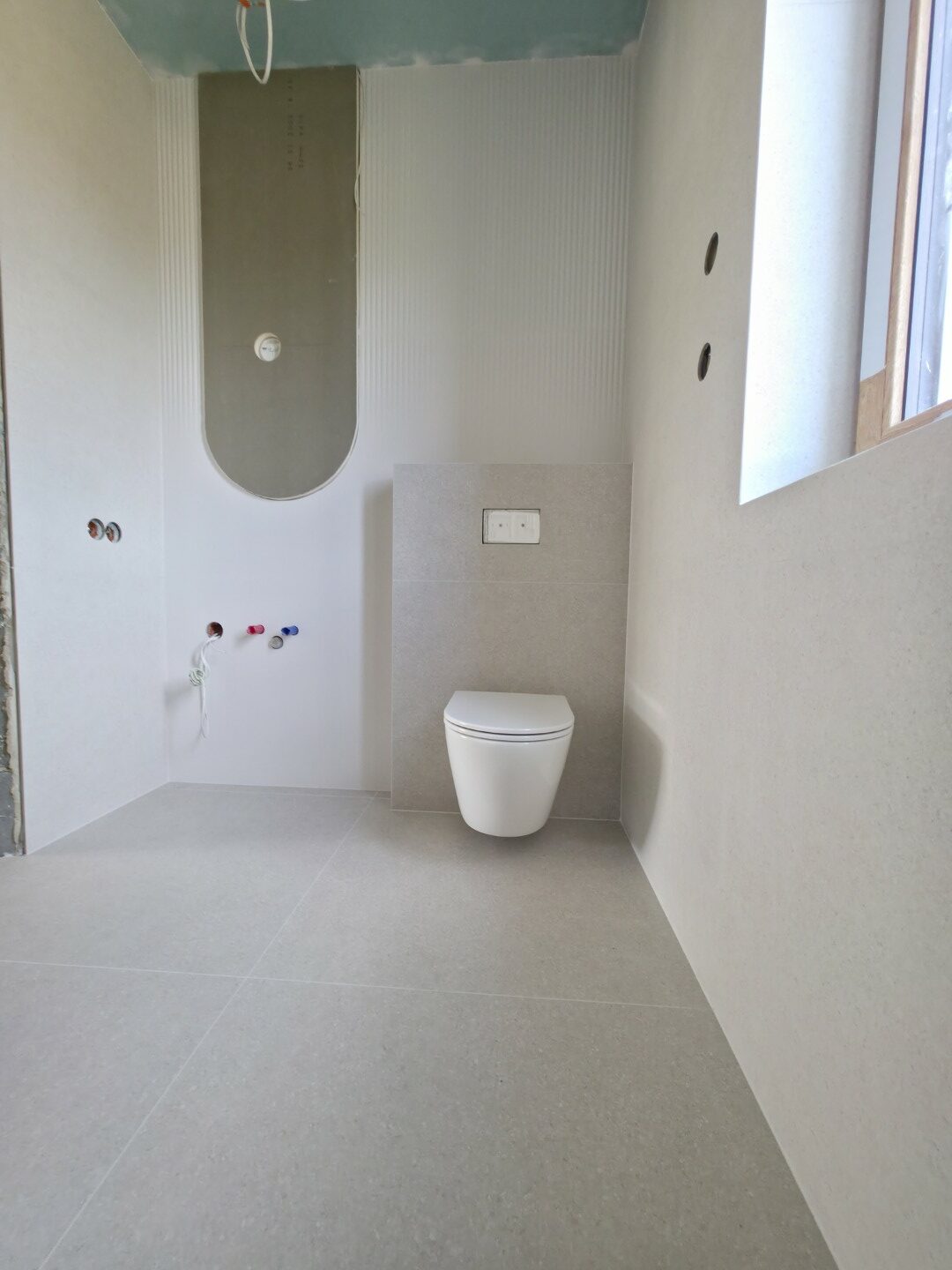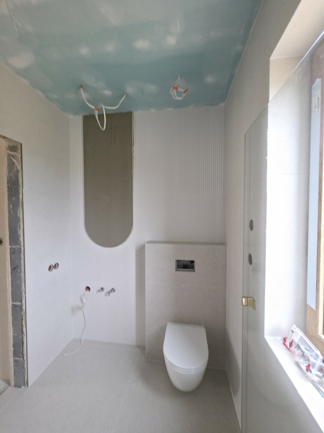 Projekt wymagał też precyzyjnego przygotowania ścian pod konkretne wyposażenie jeszcze na etapie „brudnym”. Ściana umywalkowa została wykończona białą płytką strukturalną (dekor) i przygotowana pod montaż nietypowego lustra z oświetleniem LED i zaokrąglonym dołem. To pokazuje, że myślimy o efekcie końcowym już przy kładzeniu instalacji.